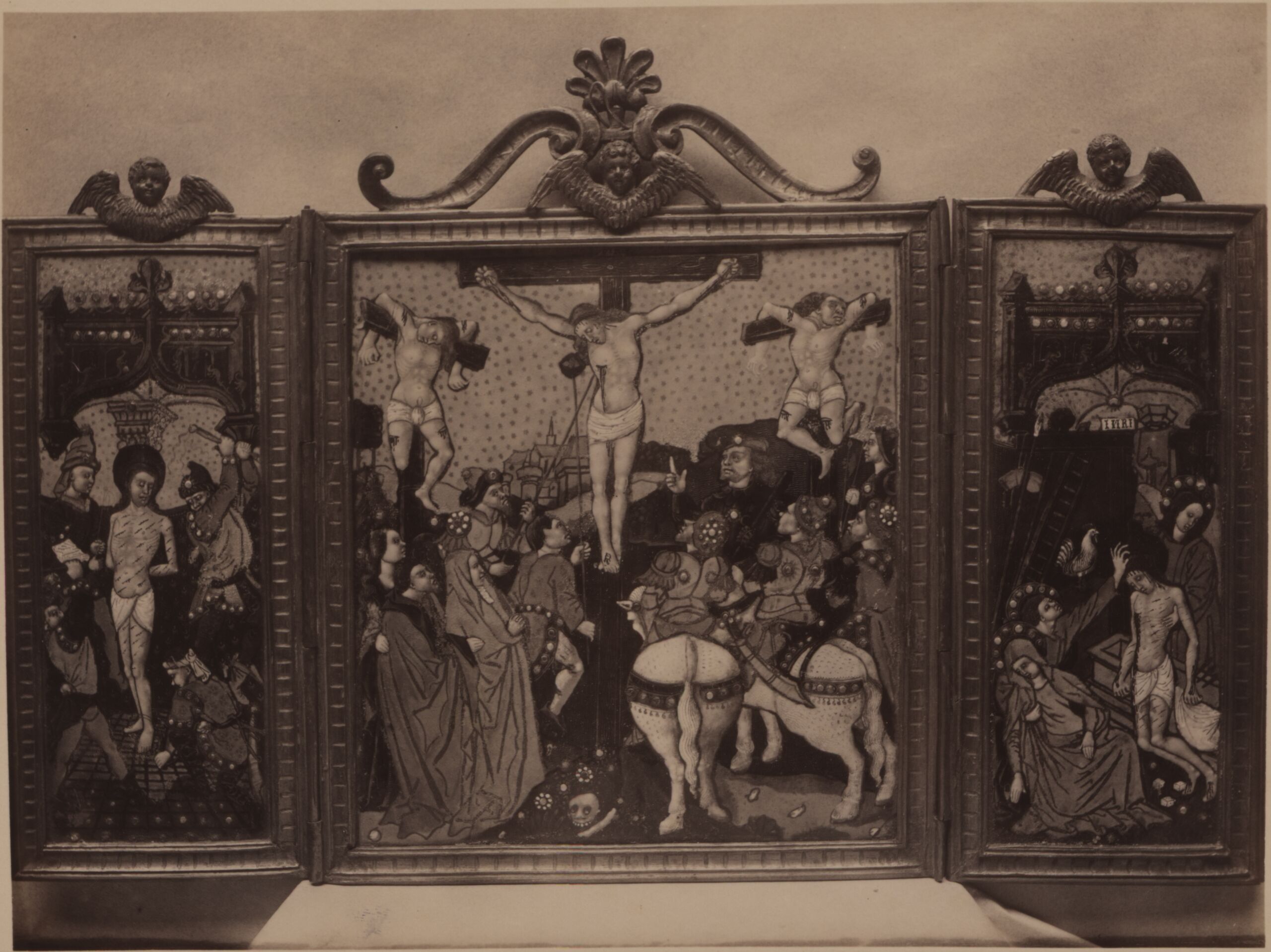 photograph, Fotografie eines Triptychons mit Emailmalereien von Nardon Pénicaud aus Limoges mit einer Darstellung der Kreuzigung Christi, um 1500, Adolphe Giraudon, MAK Inv.nr. KI 7341-31
