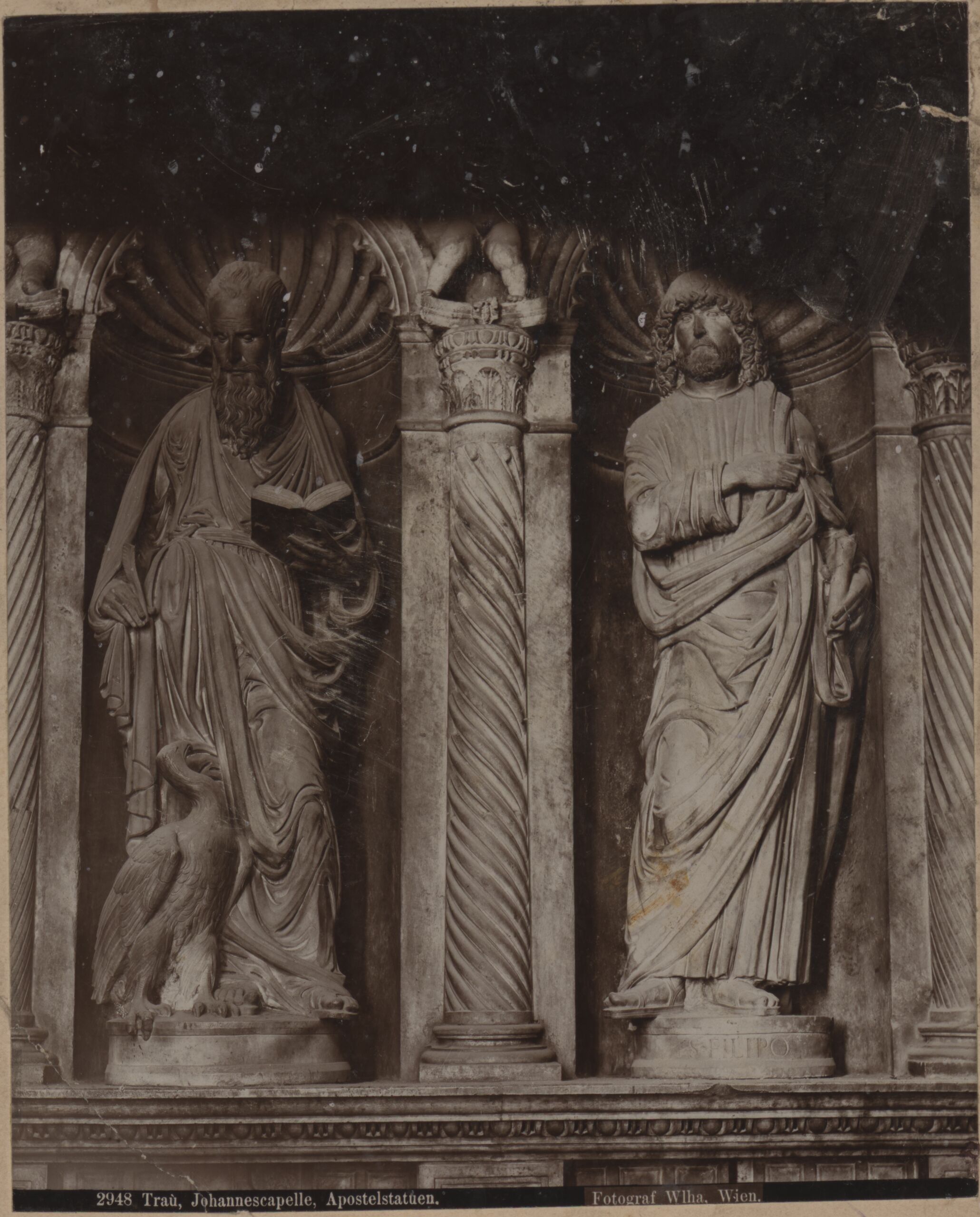- text on object (unten) : 2948 Trau, Johannescapelle, Apostelstatuen. / Fotograf Wlha, Wien.