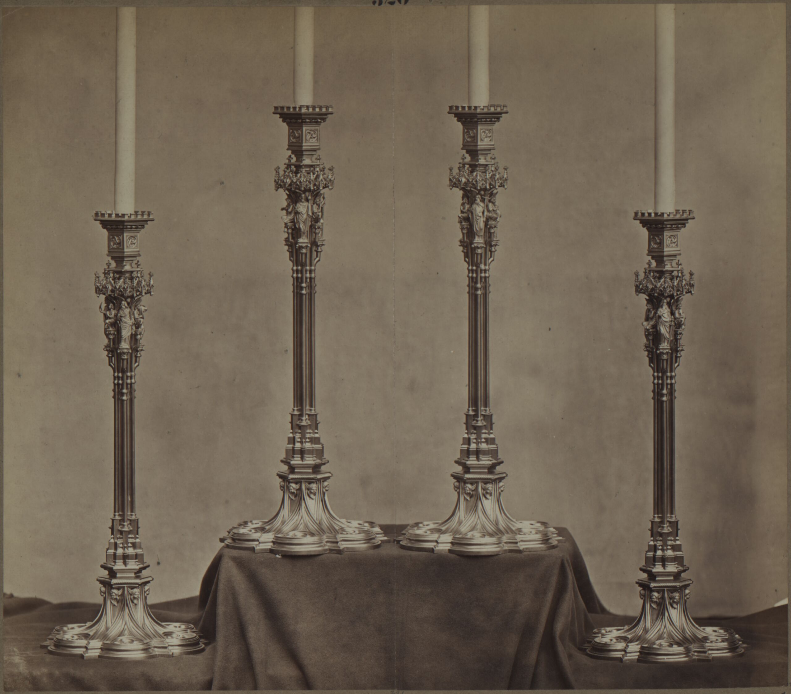 - Fotografie von vier bronzenen Kerzenständern der Erzgießerei und Bronzewarenfabrik D. Hollenbach (given title)