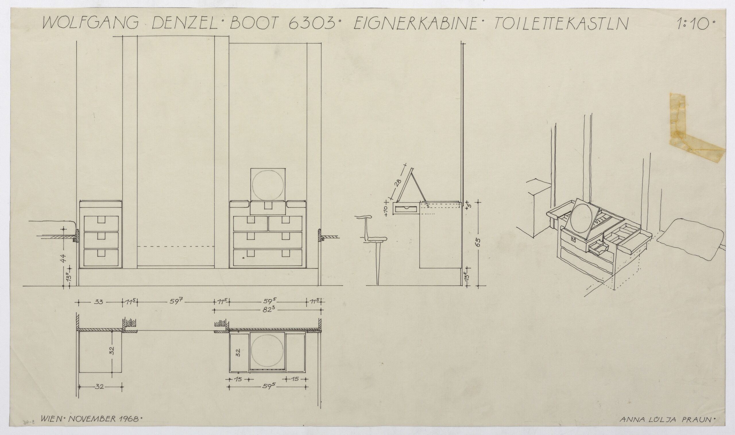 design, Frontal- und Seitenansicht, Grundriss und Innenraumdarstellung eines Toilettetisches für die Eignerkabine, Anna-Lülja Praun, MAK Inv.nr. KI 16475-9-46