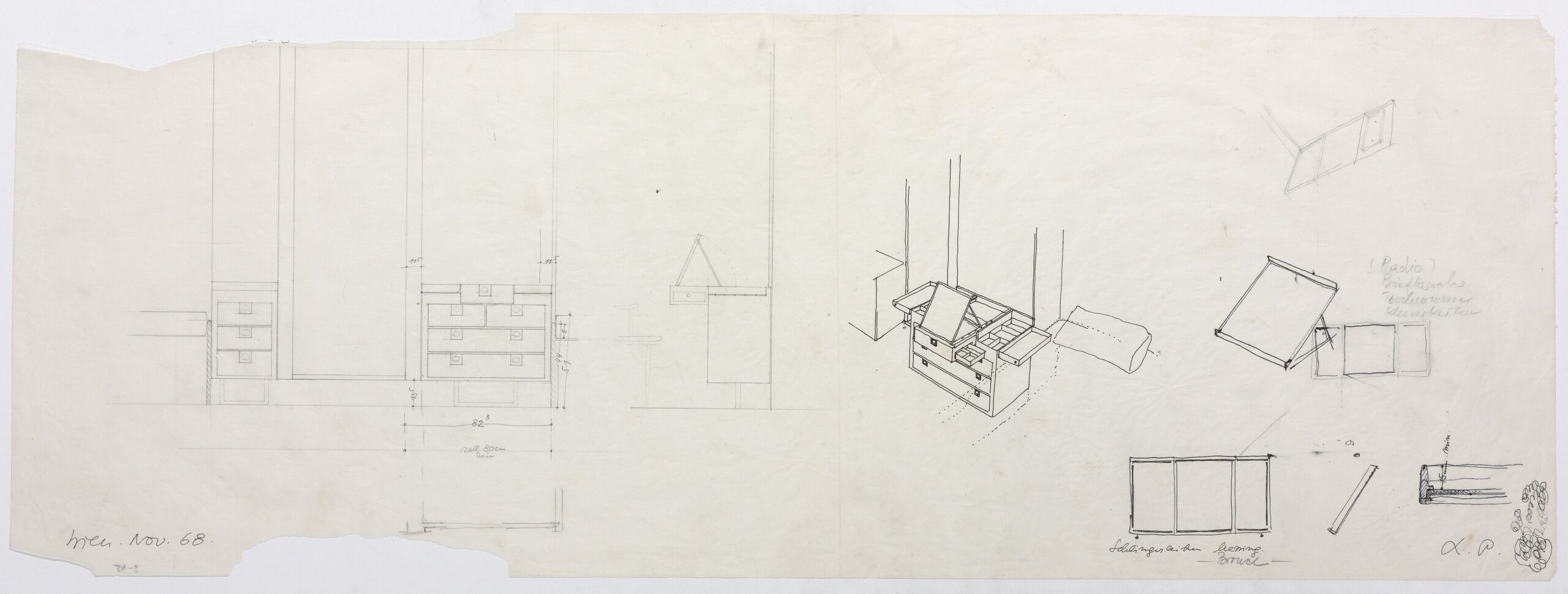design, Frontalansicht und Innenraumdarstellung eines Toilettetisches, Details zum Spiegel , Anna-Lülja Praun, MAK Inv.nr. KI 16475-9-45