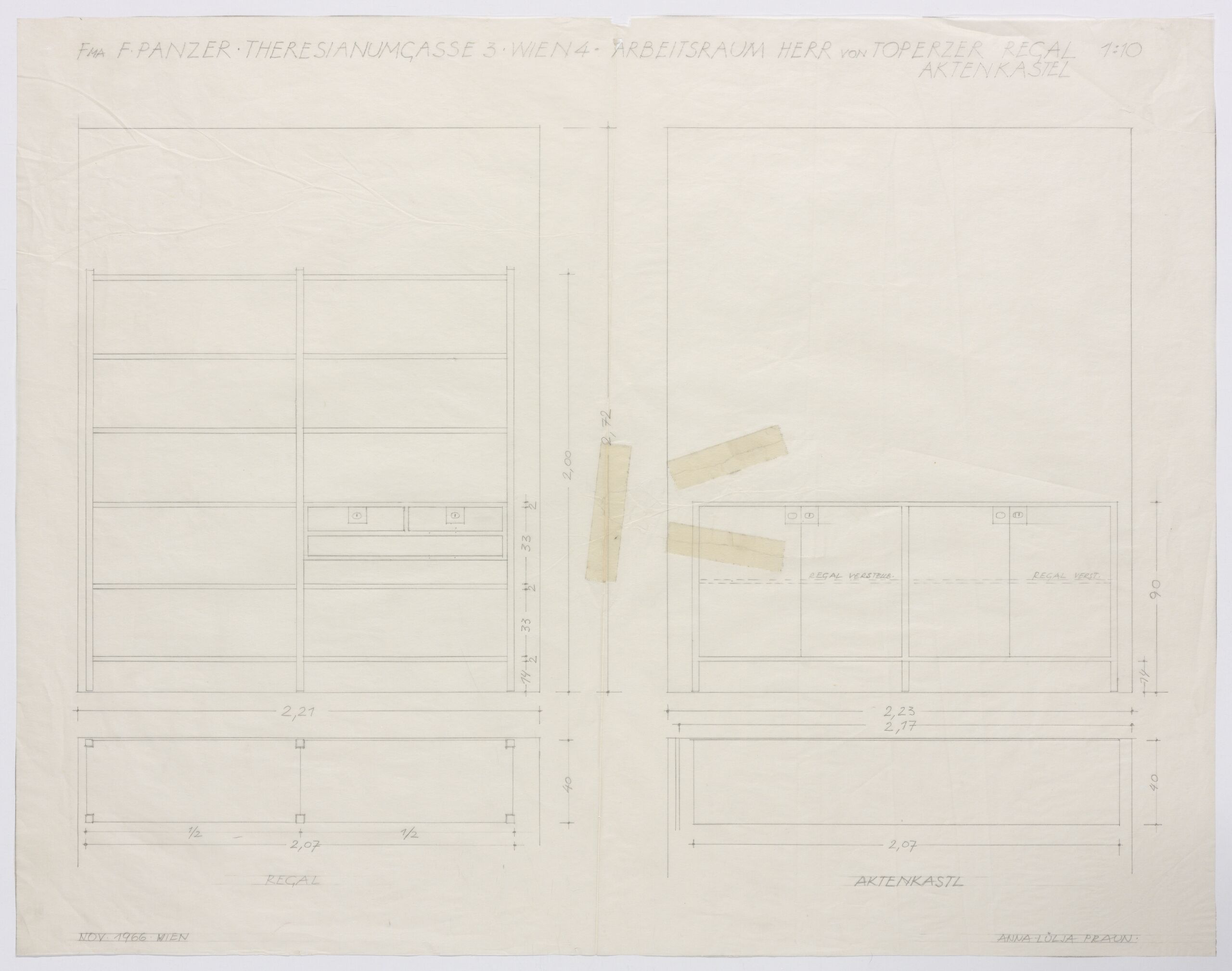 - text on object (oben) : FMA F PANZER THERESIANUMGASSE 3 WIEN 4 ARBEITSRAUM HERR VON TOPERZER REGAL 1:10 / AKTENKASTEL