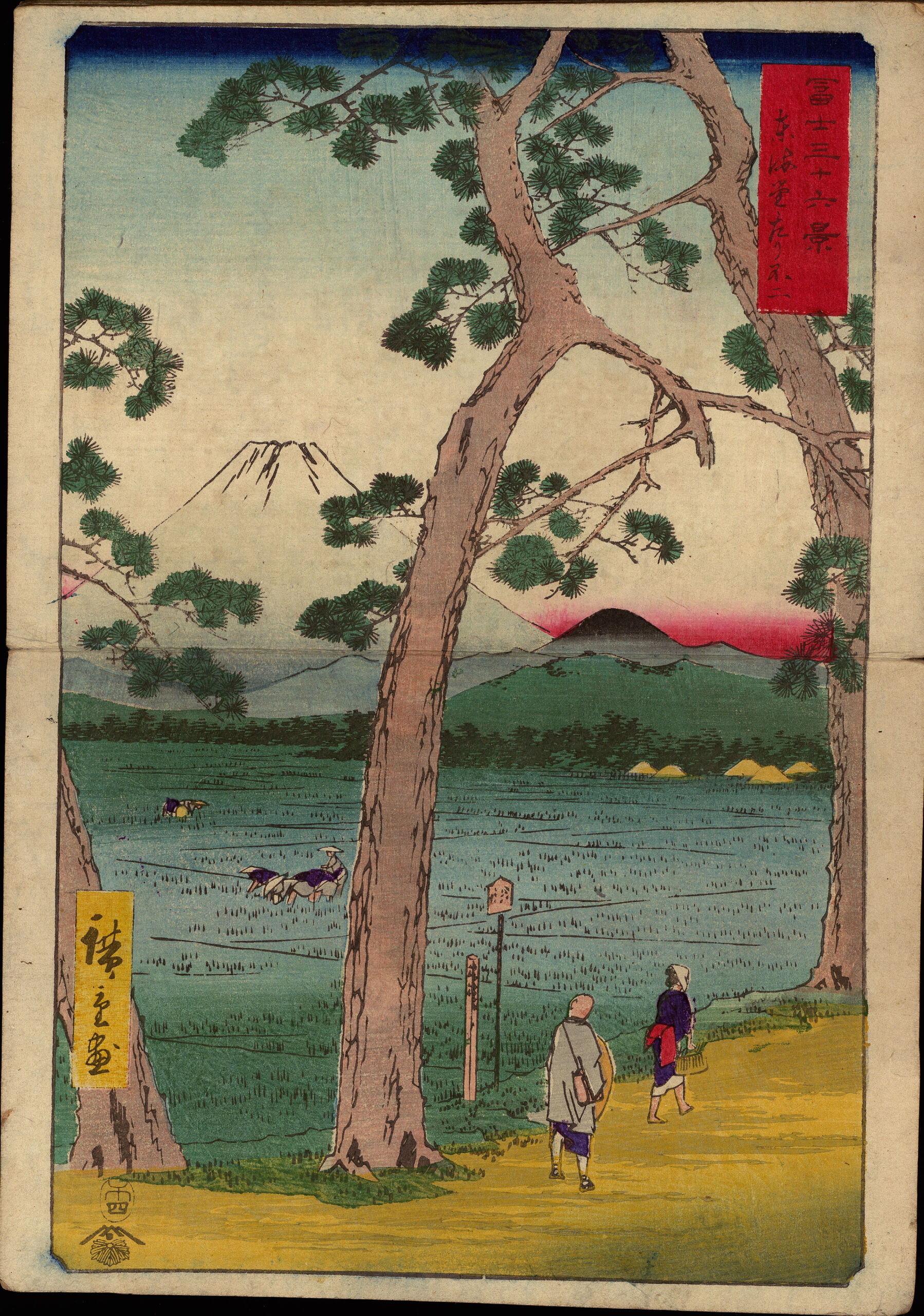 Serie der 36 Ansichten vom Berg Fuji von Hiroshige. Blick auf den Fuji von der Tōkaidō-Landstraße aus. Das besondere und namensgebende hier ist, dass bei der Reise auf der Tōkaidō 東海道 von Edo nach Kyōto der Fuji immer auf der rechten Seite liegt. In der Nähe der Station Yoshiwara macht der Weg jedoch eine Biegung und die Reisenden bekommen den Fuji plötzlich auf der linken Seite zu sehen. Ein Priester und eine Frau. Auf dem Feld arbeitende Bauern. Das Bild hier mit einer gelben Signatur-Kartusche. Vgl. dazu Bemerkung bei BI 17426-2-1.