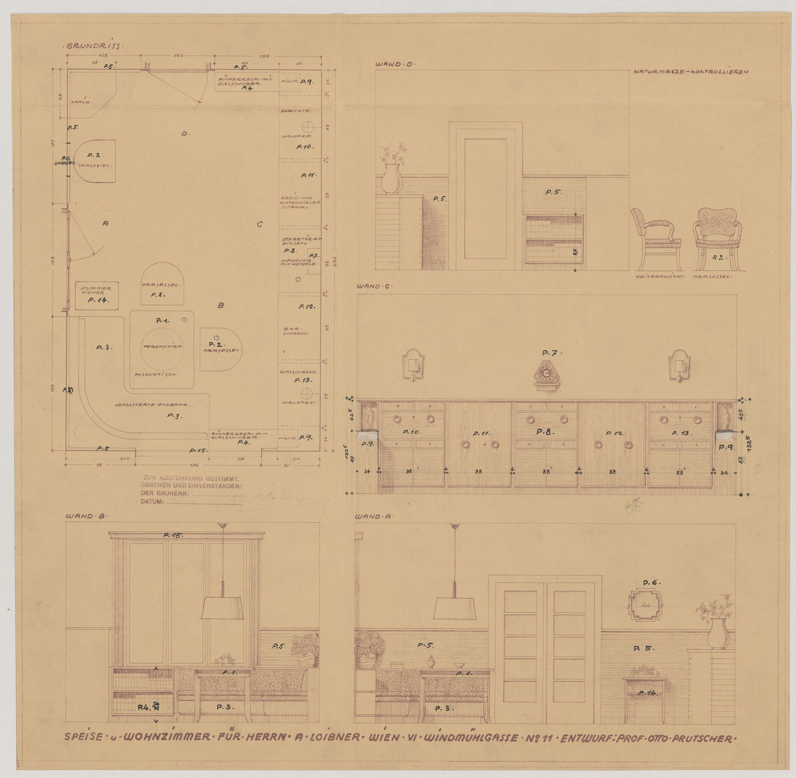 • Furnishing plan with floor plan and wall elevations for the dining and living rooms for Mr. Alfred Loibner, Vienna’s 6th district, Windmühlgasse 11 (given title)