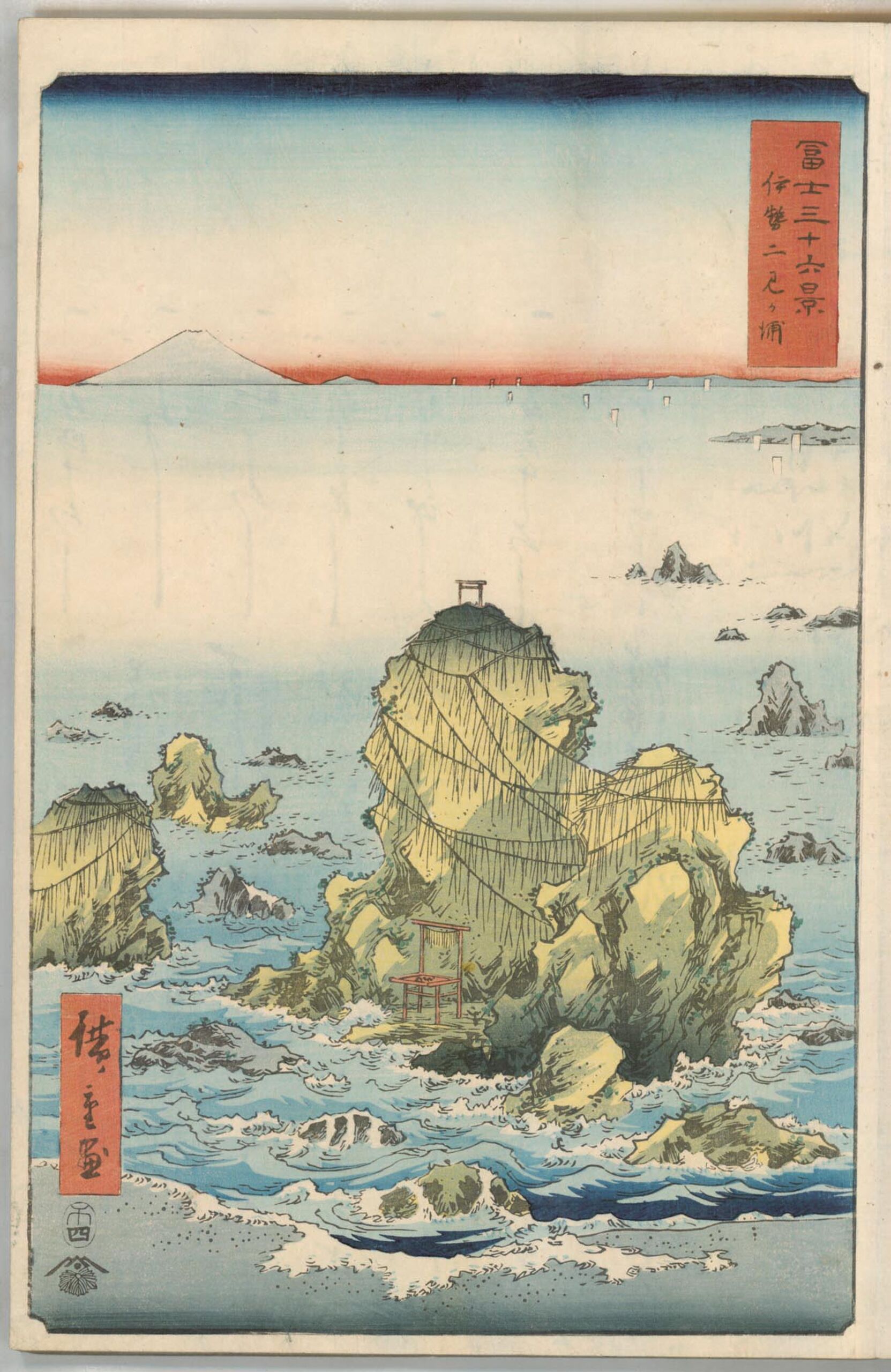 Serie der 36 Ansichten vom Berg Fuji von Hiroshige. Blick auf den Fuji von der Futami-Bucht (Futamigaura 二見ヶ浦) aus. Die Attraktion dieser Bucht sind zwei Felsen, nämlich ein kleinerer und ein größerer, die Mann und Frau bzw. das Schöpferpaar Izanami und Izanagi symbolisieren. Hiroshige lässt sie hier sehr groß wirken, in Wirklichkeit sind sie eher niedrig. Auch der Fuji ist zu groß geraten, da er von dieser Entfernung aus nicht so groß gesehen werden kann. Das Bild im Heidelberg-Katalog hat eine gelbe Signatur-Kartusche (vgl. Lit.).