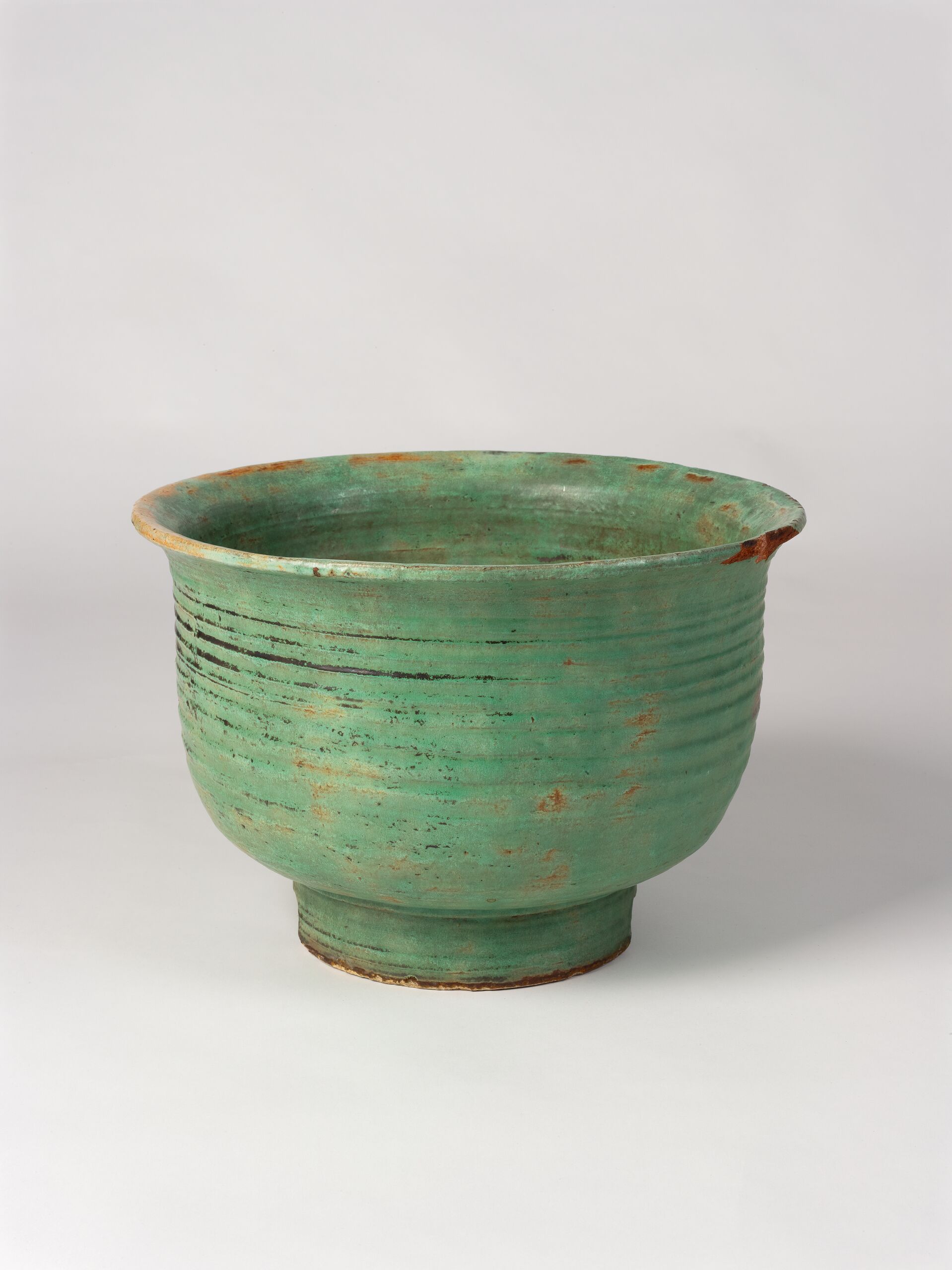 Großes Gartengefäß. Grün-schwarz glasiert. Glockige quergerillte Form