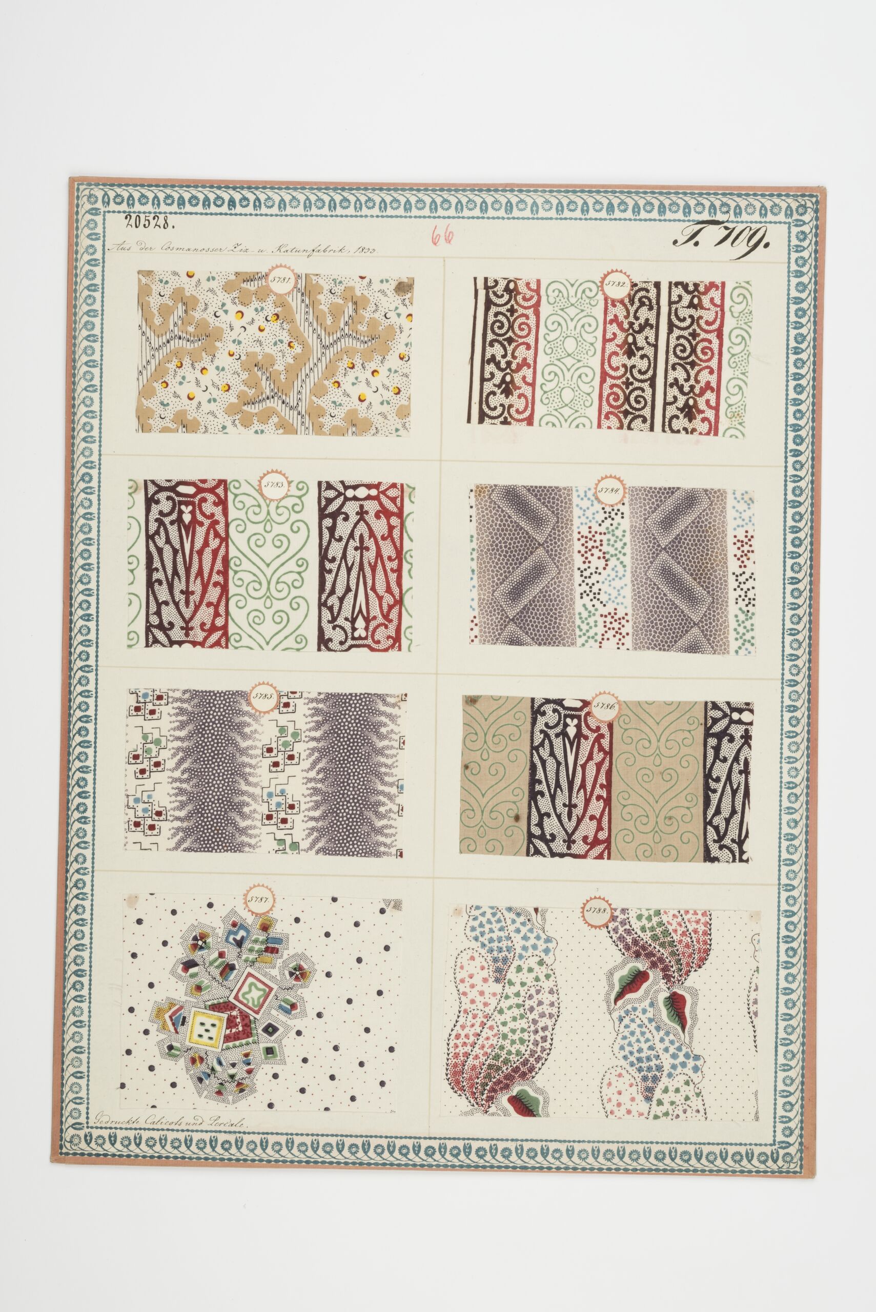 - text on object (front) : Aus der Cosmanosser Ziz- und Kattunfabrik, 1833. / Gedruckte Calicots und Percale.