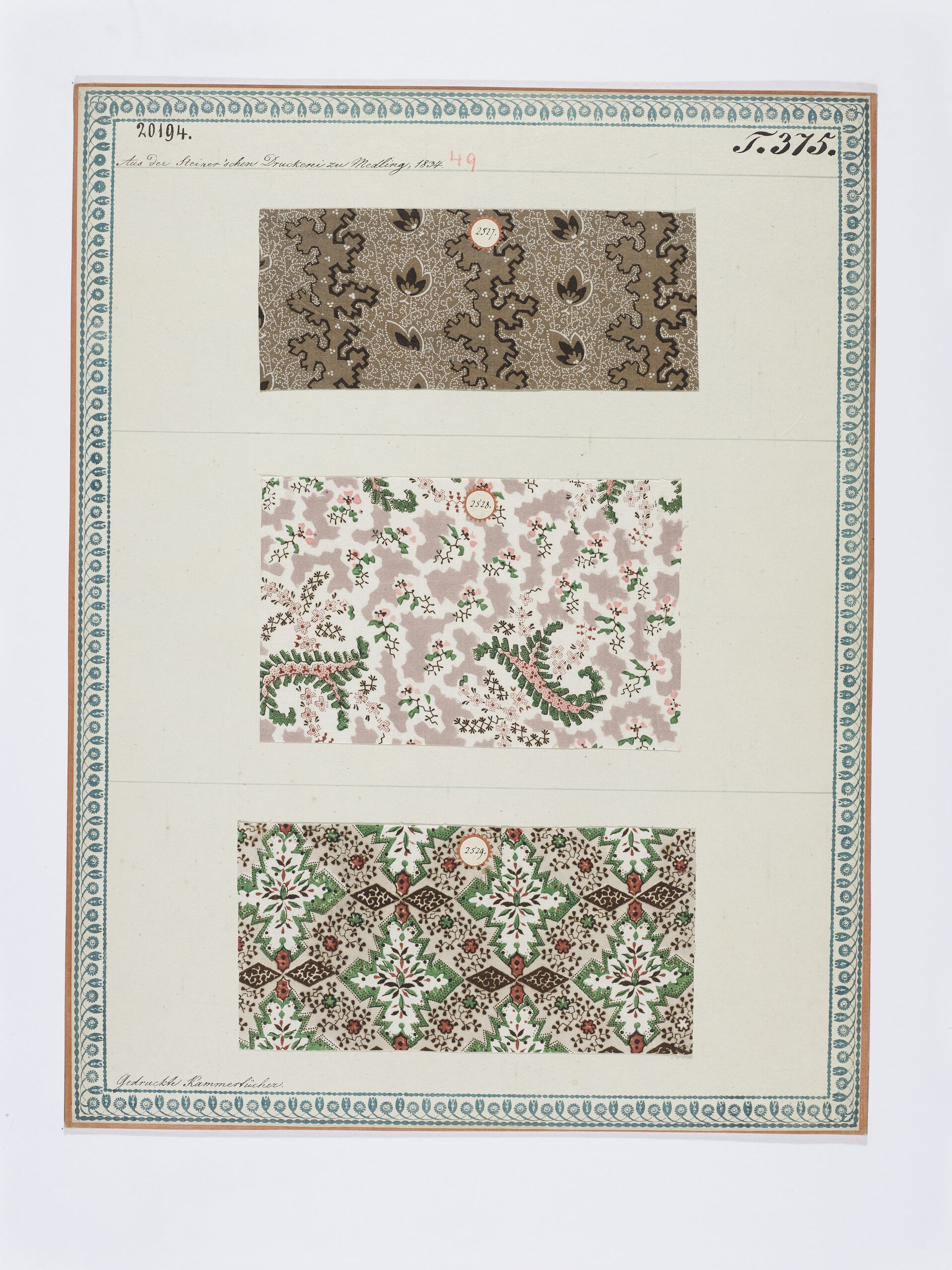 - label (front) : Aus der Steiner'schen Druckerei zu Mödling, 1834. / Gedruckte Kammertücher.