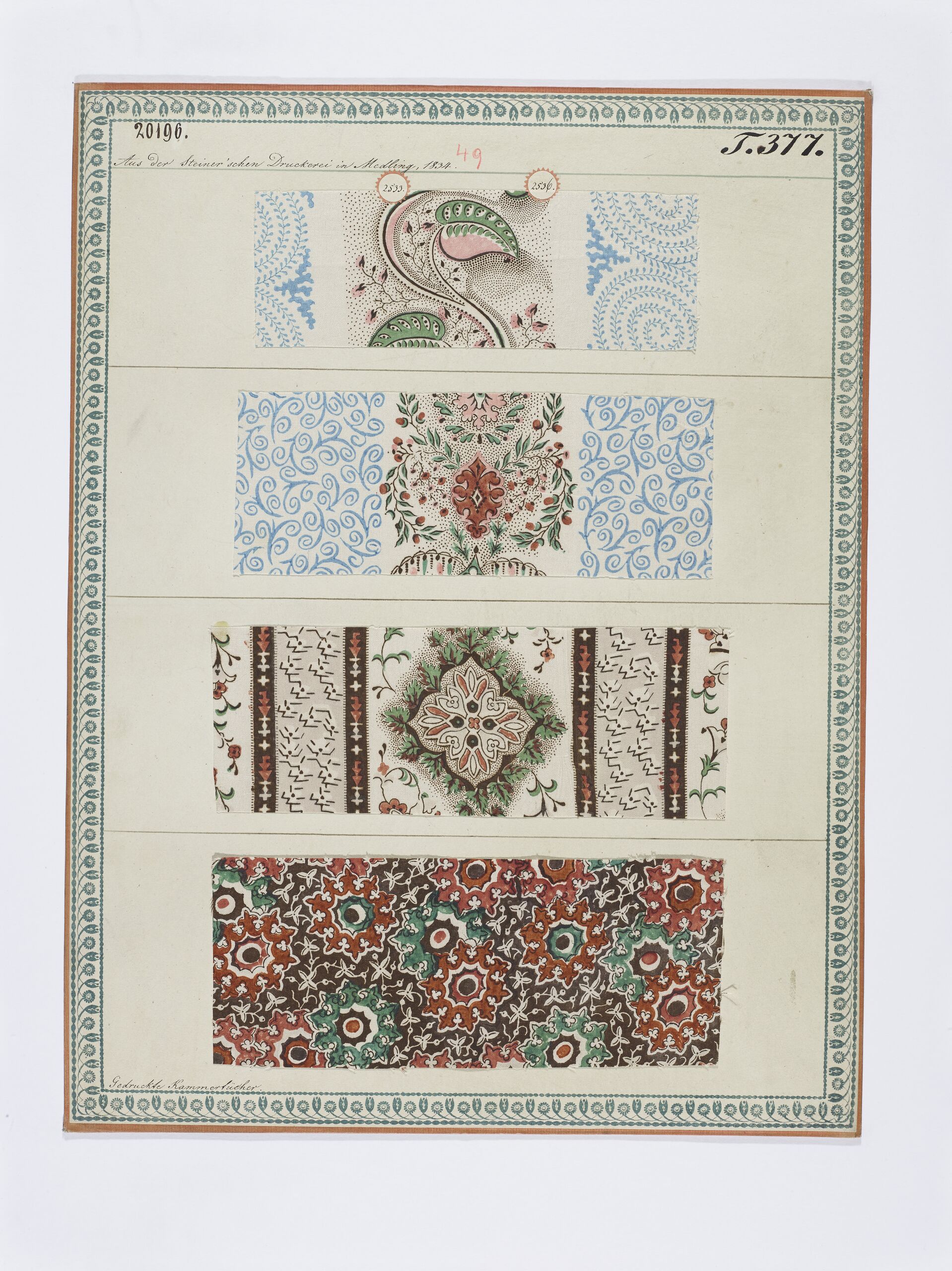 - label (front) : Aus der Steiner'schen Druckerei zu Mödling, 1834. / Gedruckte Kammertücher.