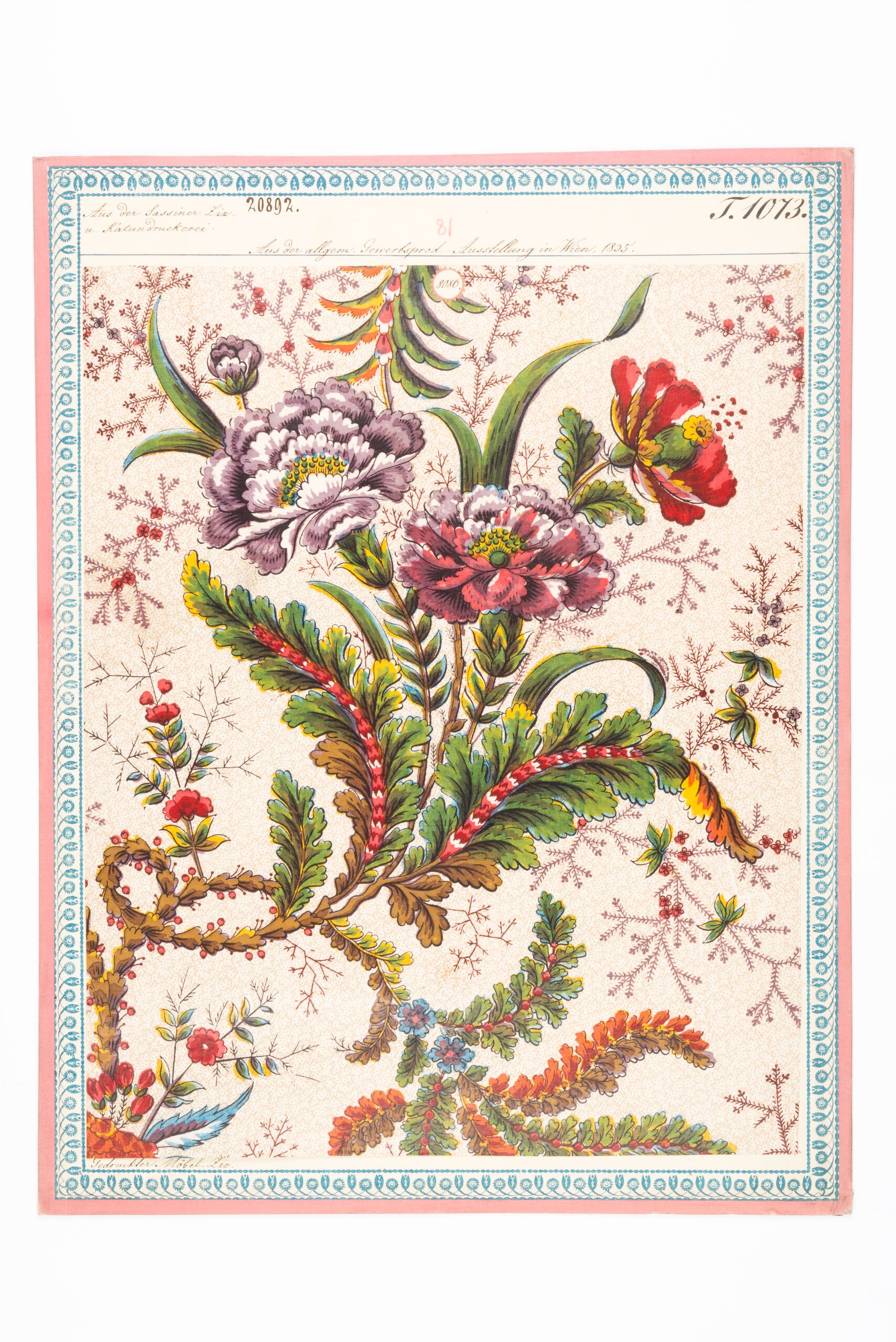 - label (front) : Aus der Sassiner Ziz- und Kattundruckerei. / Aus der allgemeinen Gewerbsprod.-Ausstellung in Wien 1835. / Gedruckter Möbel-Ziz.