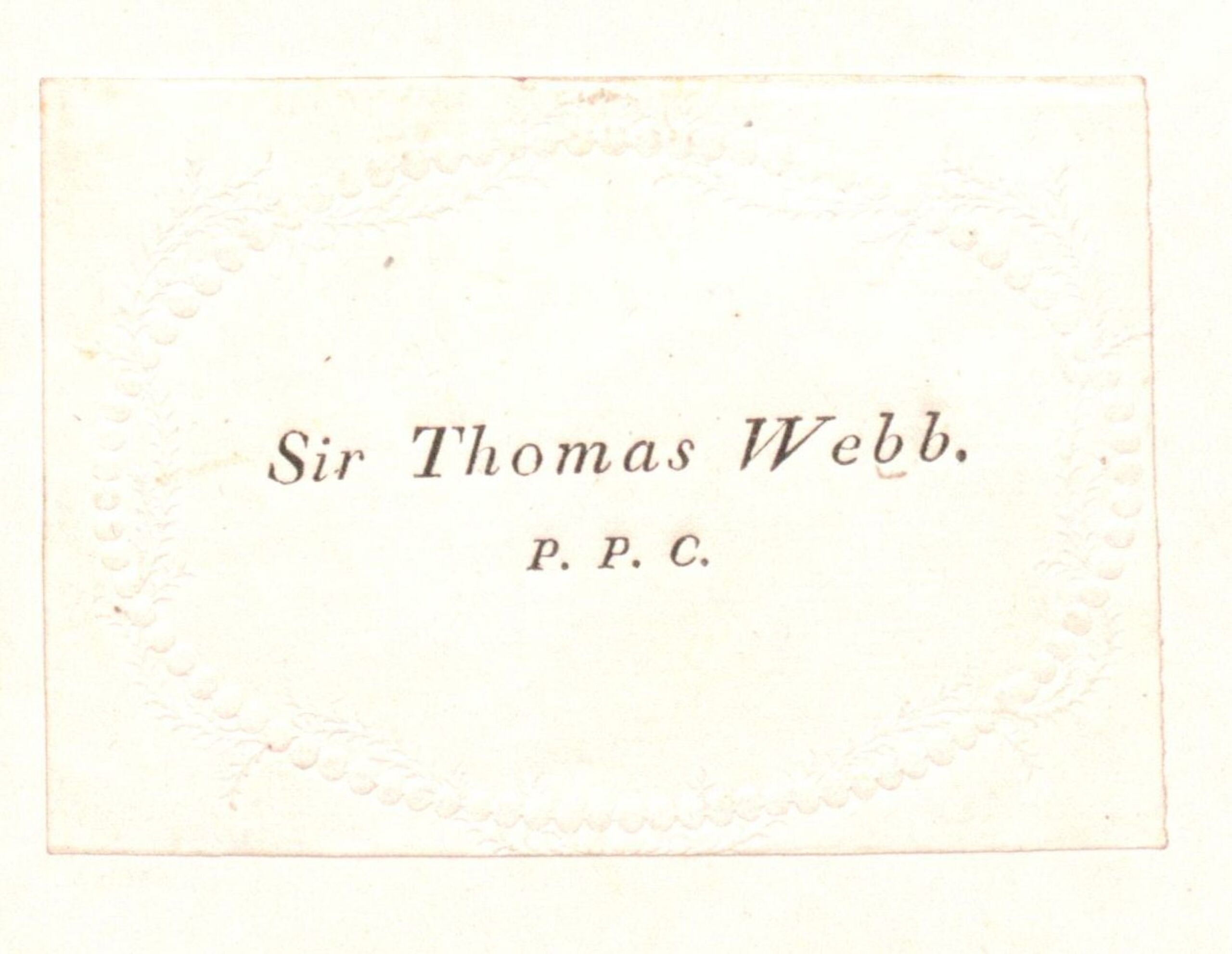 - text on object: [In der Mitte:] Sir Thomas Webb. / P.P.C. [Gedruckter Text] [Verso:] Wiedergegeben[Handgeschriebener Text, Feder in braun]