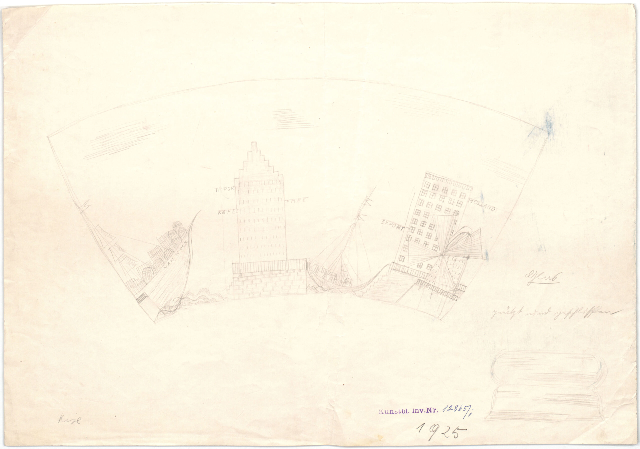 design, “Glas” [Glass] with ship “Van Hock,” skyscraper “Import/Thee/Kafee” [Import/Tea/Coffee], high-rise and windmill “Export/Holland”, Wiener Werkstätte, MAK Inv.nr. KI 12865-1