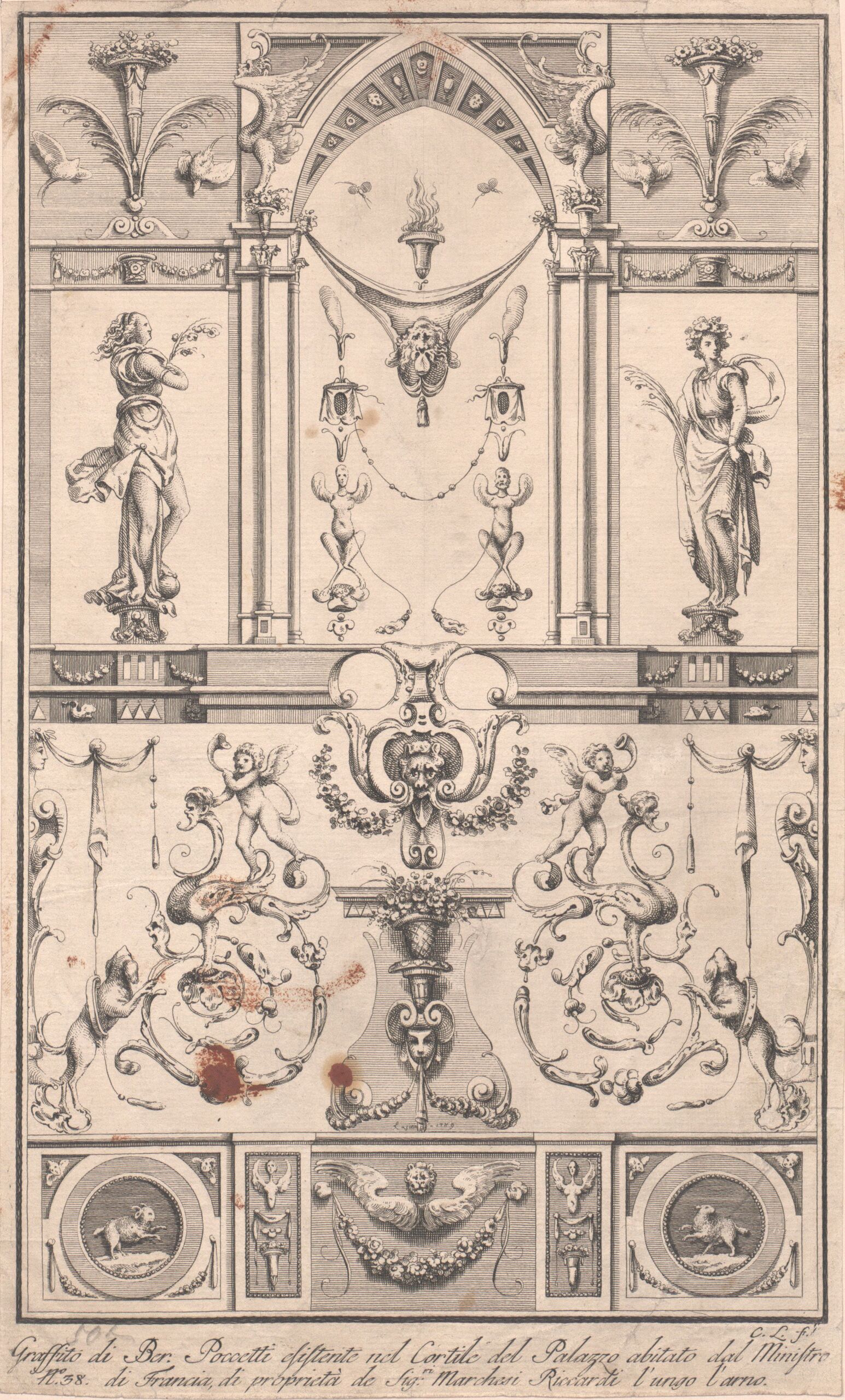 - text on object: Graffito di Ber. Poccetti esistente nel Cortile del Palazzo abitato dal Ministro/ di Francia, di proprietà de Sig.ri Marchesi Riccardi l‘ ungo l‘ arno. / Monogramm C.L. f. / N.o 38 / Lasinio 1789