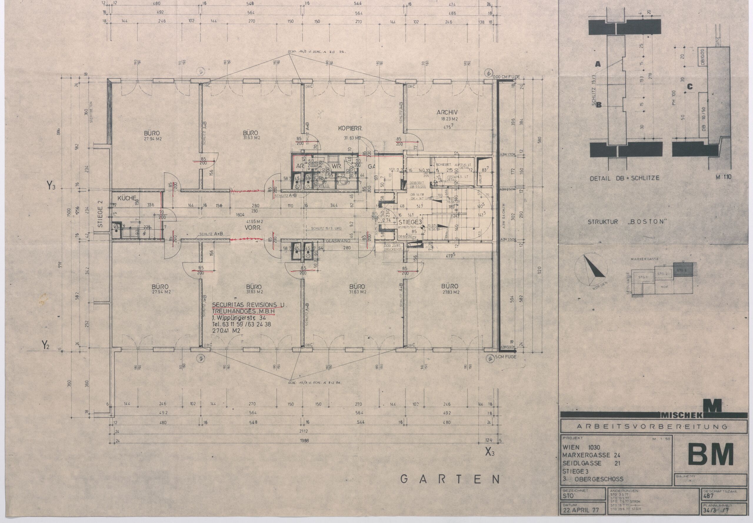 - date (rechts unten) : DATUM / 22. APRIL 77 / ÄNDERUNGEN STO 3.5.77 / STO 13.5.77 / 7.6.77 / 16.7.77 / 29.08.77