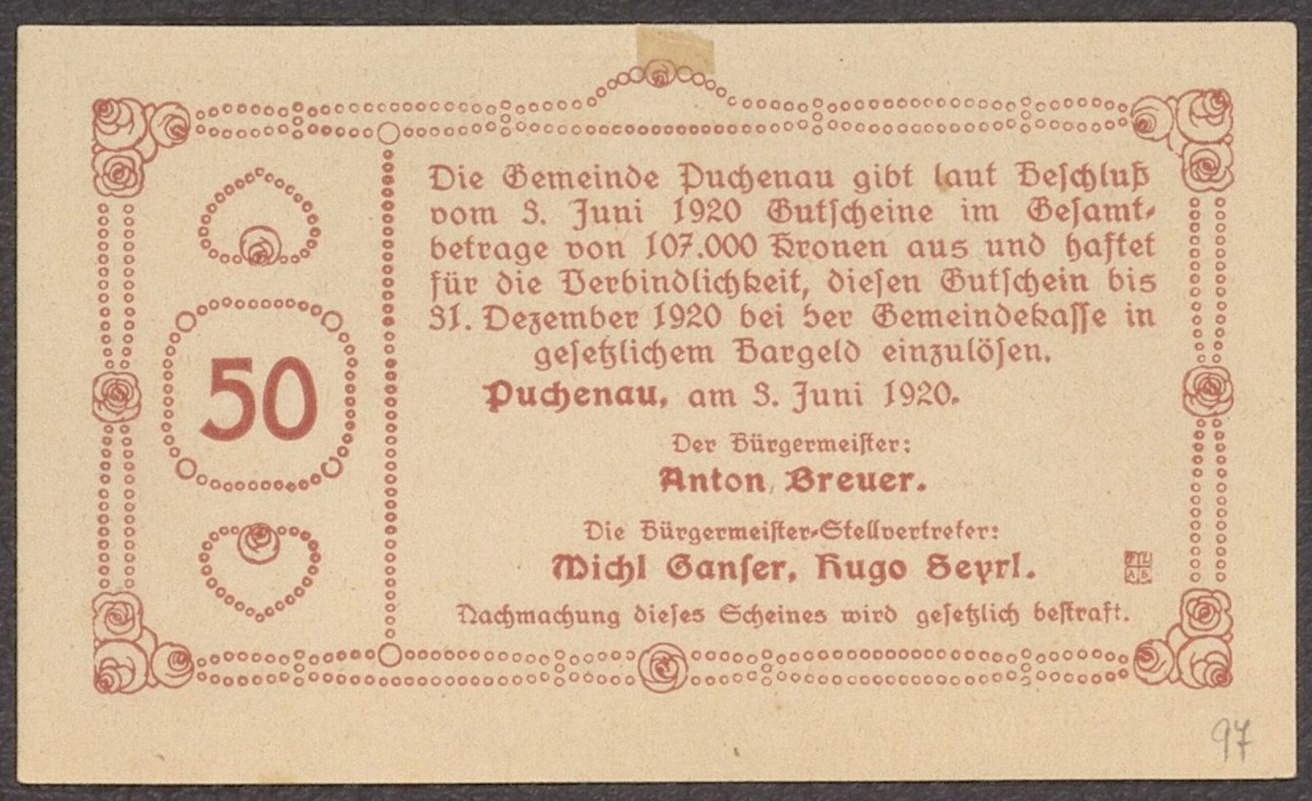 - text on object (back side) : 50 / Die Gemeinde Puchenau gibt laut Beschluß / vom 7. Juni 1920 Gutschein eim Gesamt- / betrage von 107.000 Kronen aus und haftet / für die Verbindlichkeit, diesen Gutschein bis / 31. Dezember 1920 bei der Gemeindekasse in / gesetzlichem Bargeld einzulösen. / Puchenau, am 3. Juni 1920. / Der Bürgermeister: / Anton Breuer. / Die Bürgermeister-Stellvertreter: / Michl Ganser, Hugo Seyrl. / Nachmachung dieses Scheines wird gesetzlich bestraft. / P L / A R
