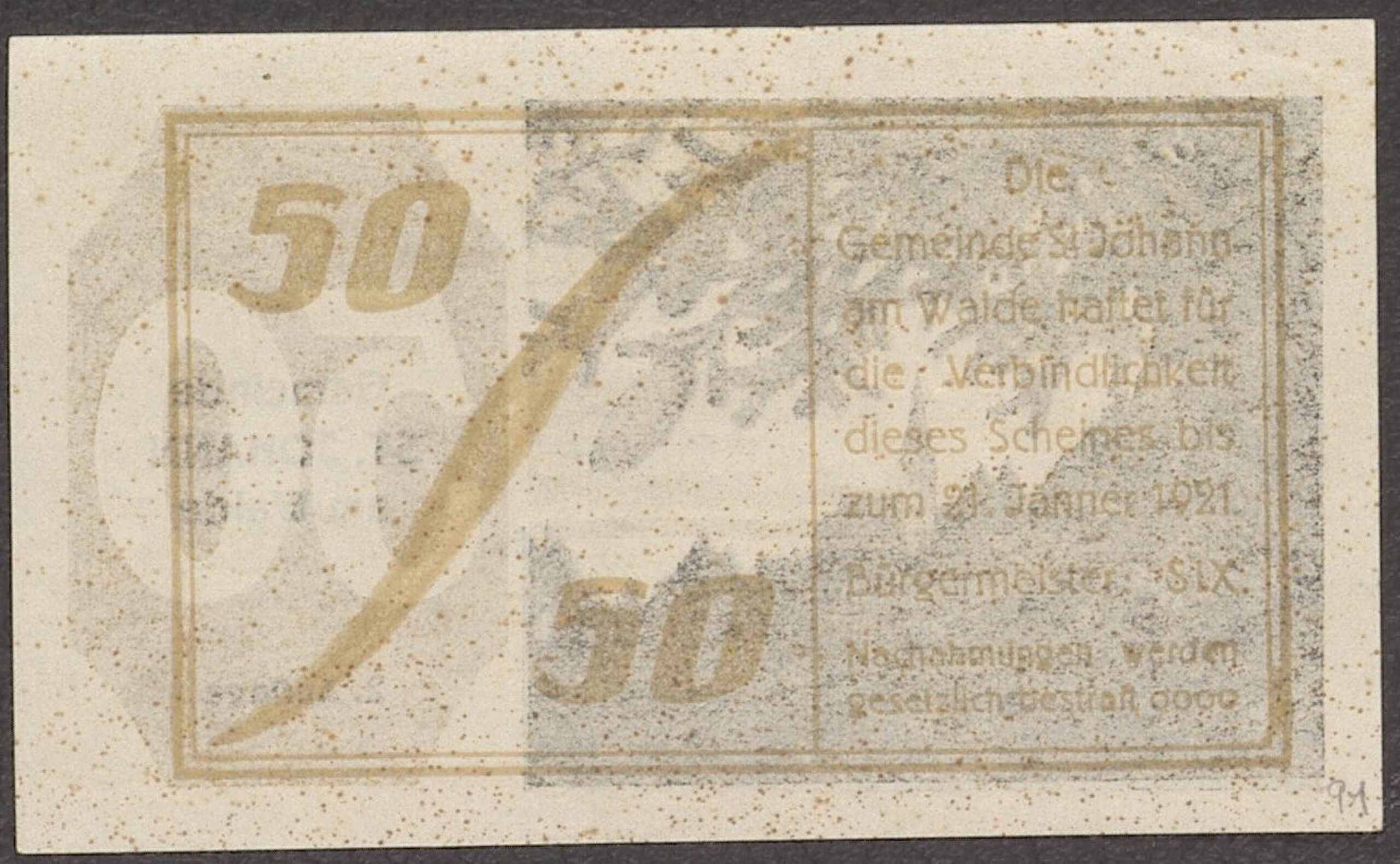 - text on object (back side) : 50 / 50 / Die / Gemeinde St. Johann / am Walde haftet für / die Verbindlichkeit / dieses Scheines bis / zum 21. Jänner 1921 / Bürgermeister: SIX / Nachahmungen werden / gesetzlich bestraft