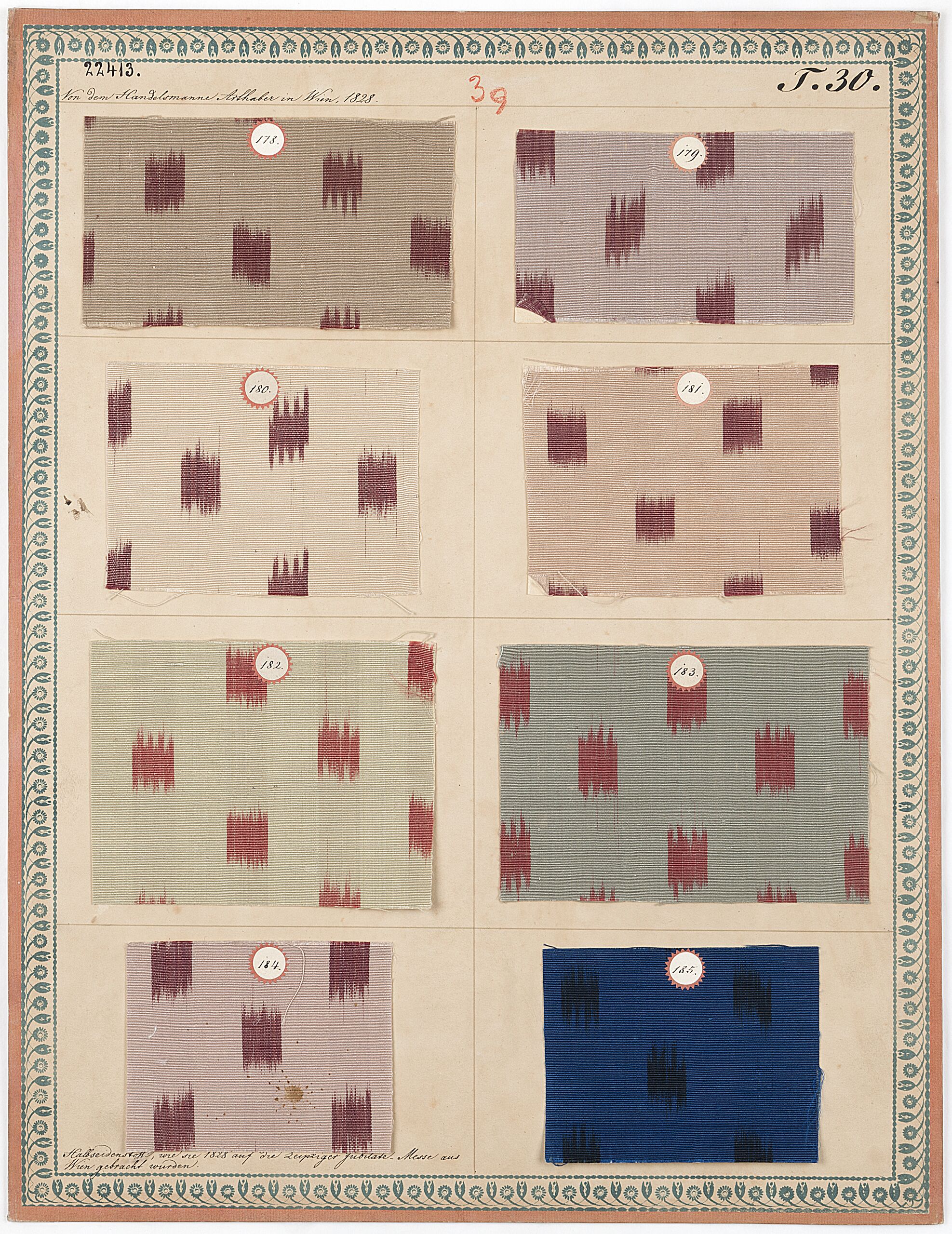 - label (front) : Von dem Handelsmanne Arthaber in Wien 1828. / Halbseidenstoffe, wie sie 1828 auf die Leipziger Jubilate-Messe aus Wien gebracht wurden.