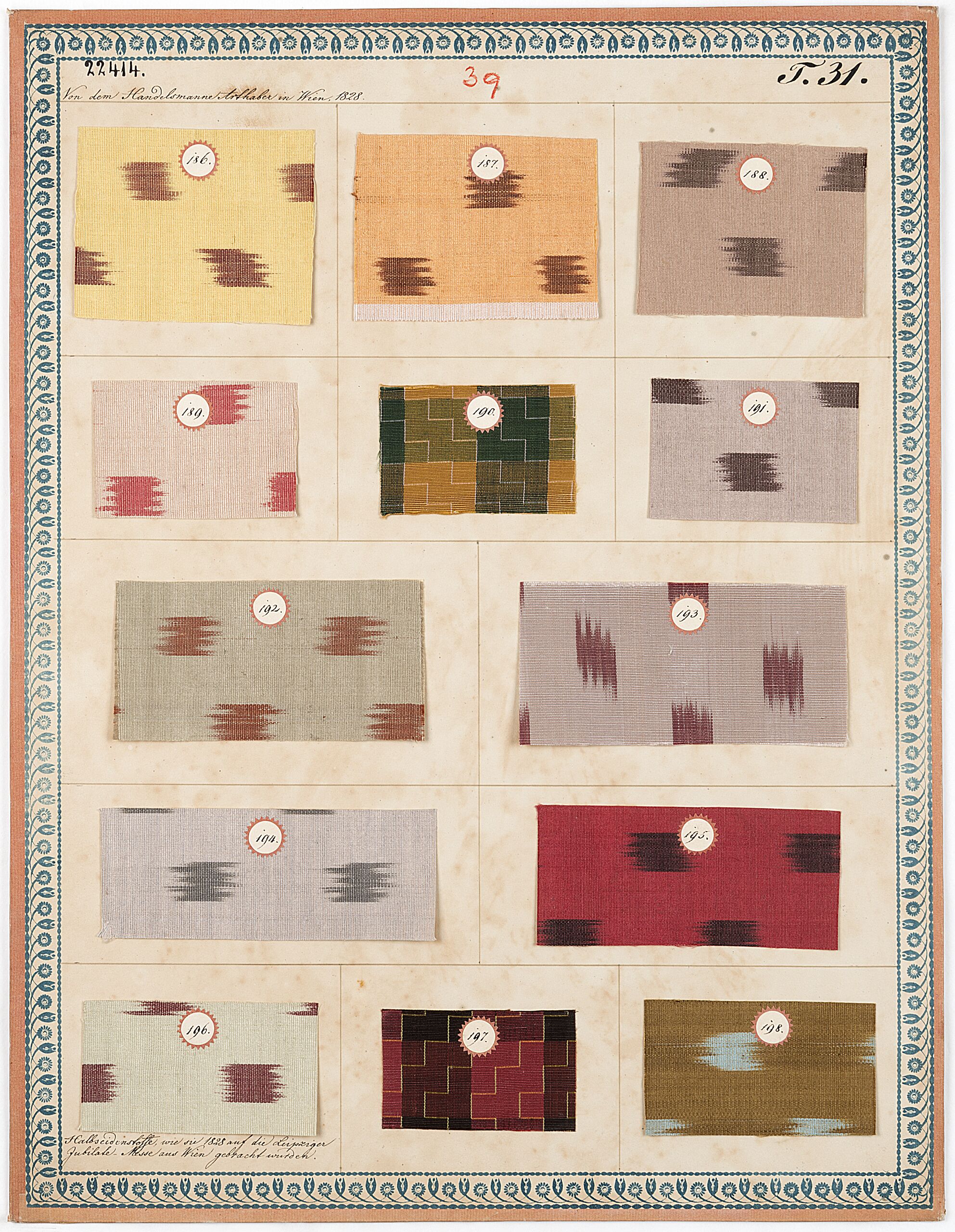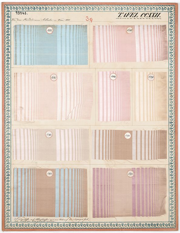 - label (front) : Von dem Handelsmanne Arthaber in Wien 1828. / Halbseidenstoffe, wie sie 1828 auf die Leipziger Jubilate-Messe aus Wien gebracht wurden.