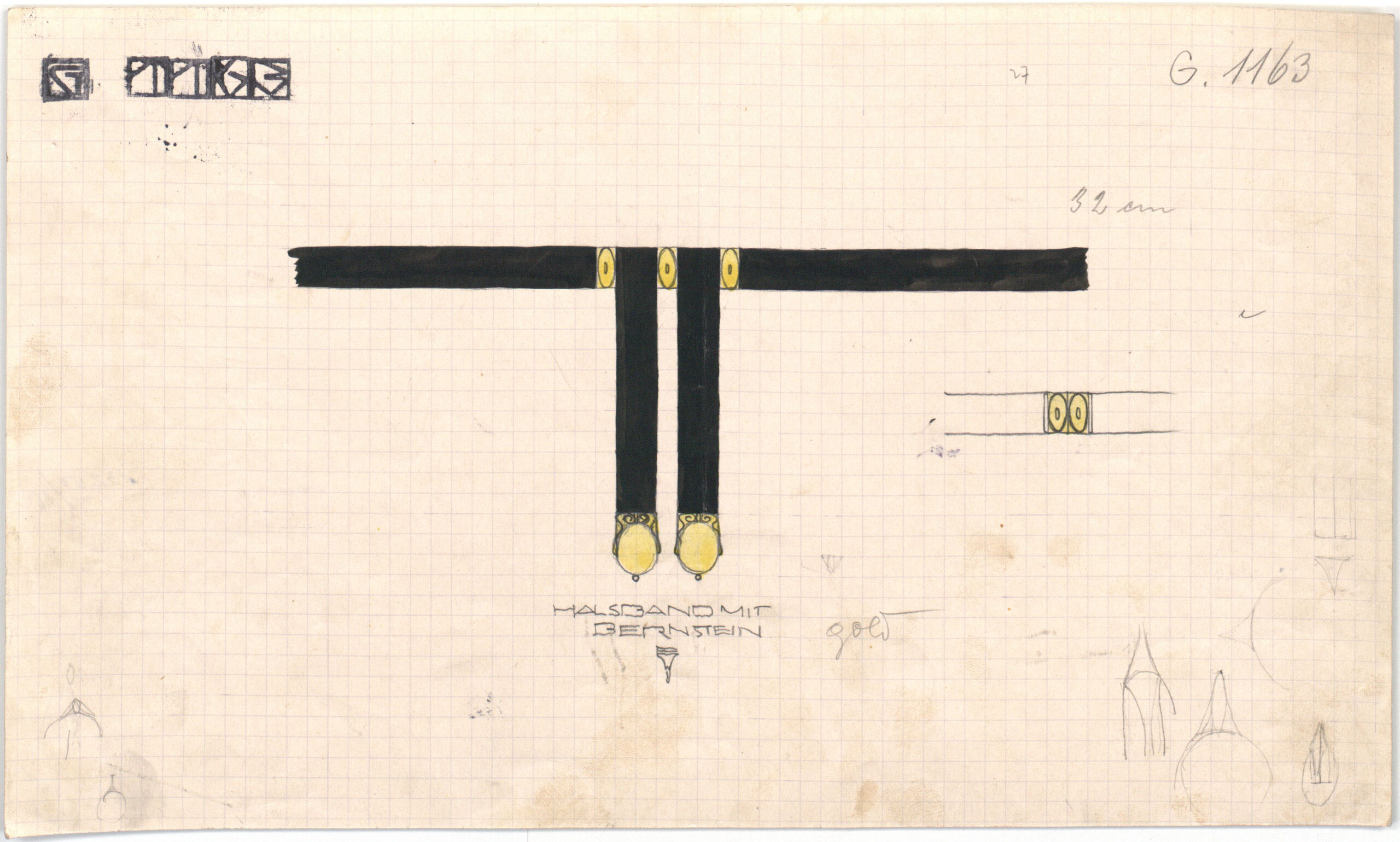 - text on object: „Halsband mit Bernstein“, „Gold“, „32 cm“