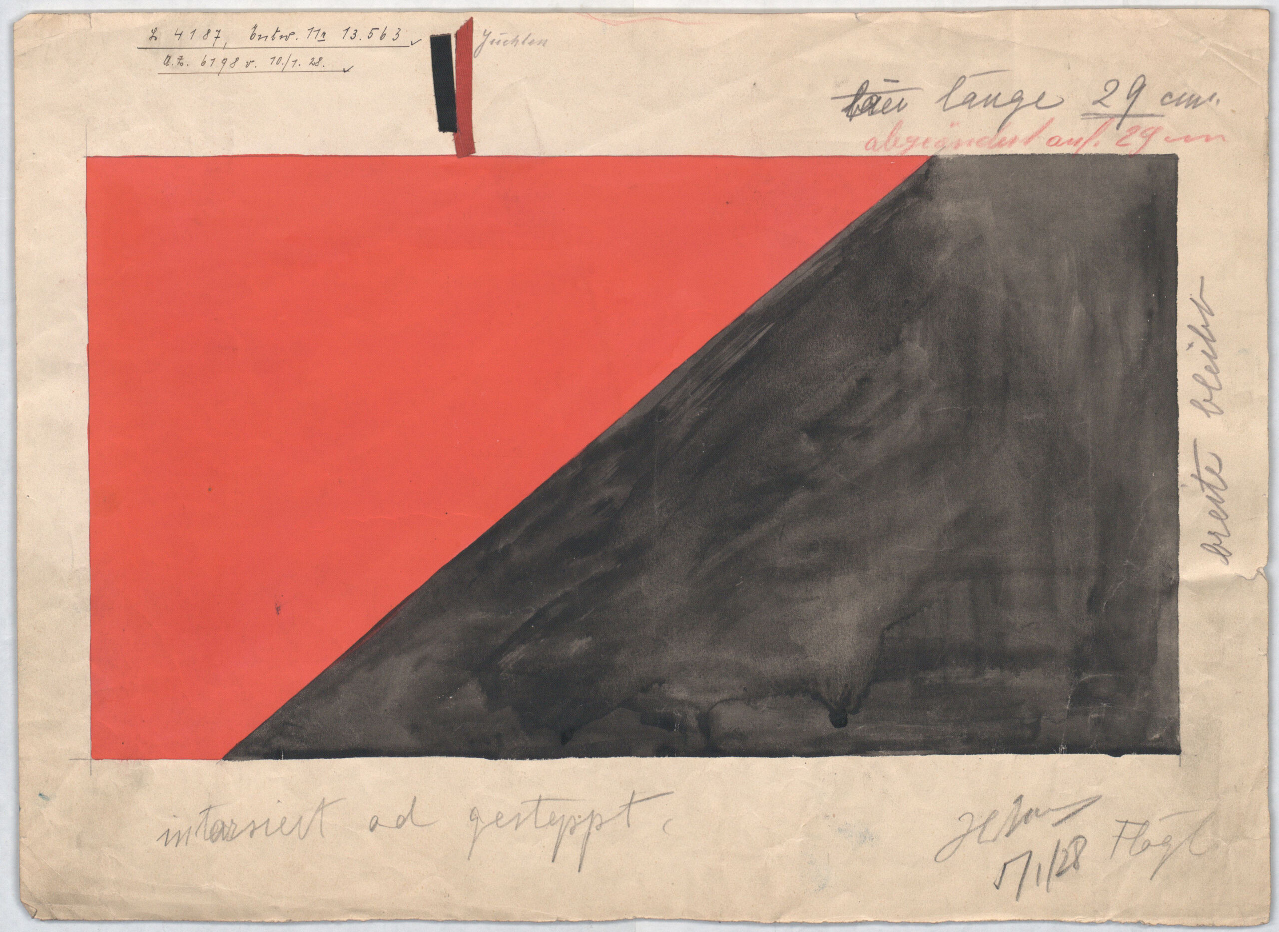 - text on object: A.Z. 6198 v. 10./1.28.Länge 29 cm./abgeändert auf 28 cm/intarsiert od. gesteppt./breite bleibtverso: 1 St. gel. 2.V.28. beige-schw. Zieg./rot. Juchten/schw. Juchten/5 St. am 6.II.28./3 St gel. 7.V.28/ 7 St. gel. 22.8.28.
