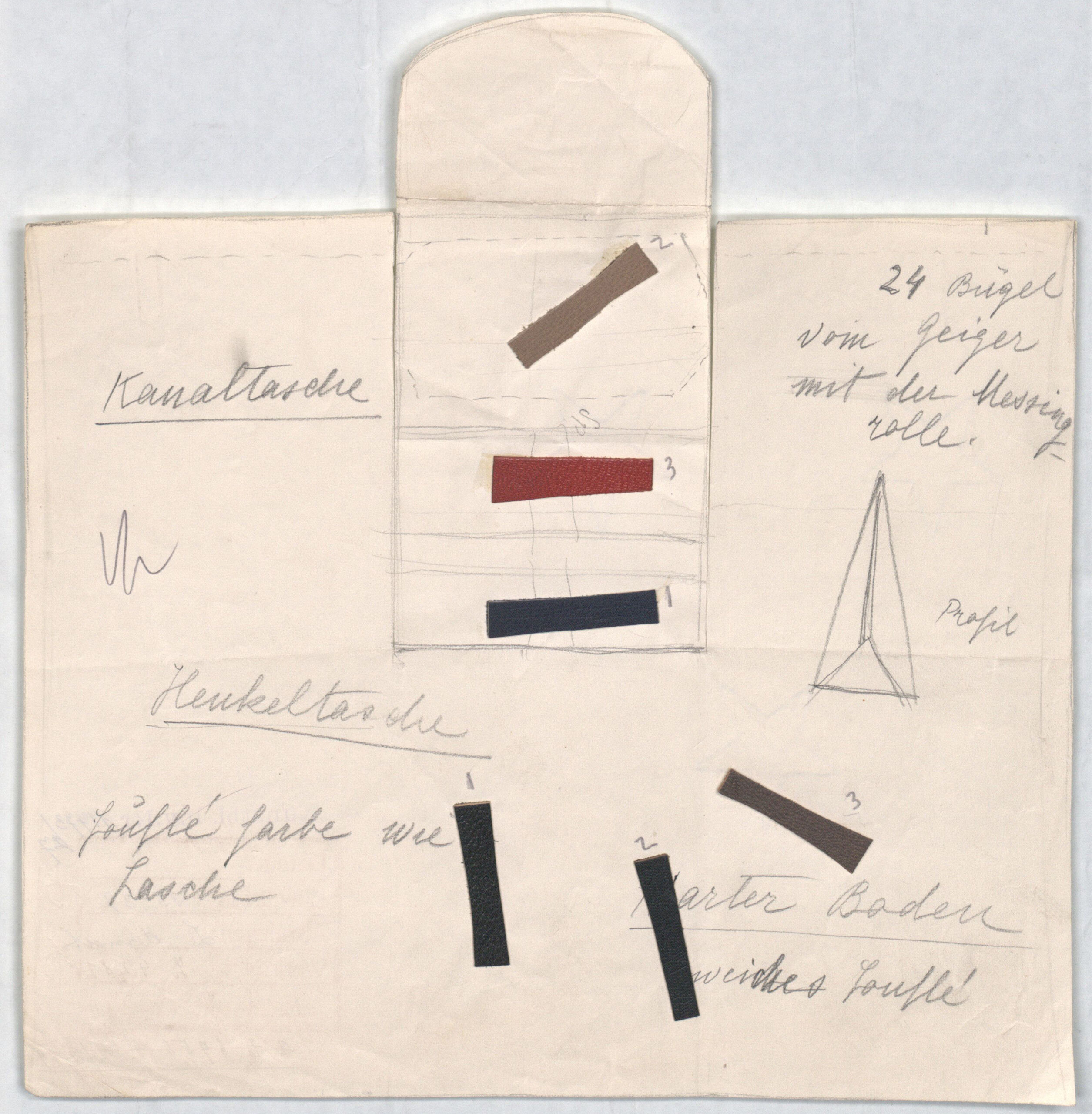 - text on object: Kanaltasche/Henkeltasche/Souflé Farbe wie Lasche/24 Bügel vom Geiger mit der Messingrolle/Profil/Harter Boden/weiches soufléverso:StornoA.Z. 6950 v. 4./2.29 (durchgestrichen)