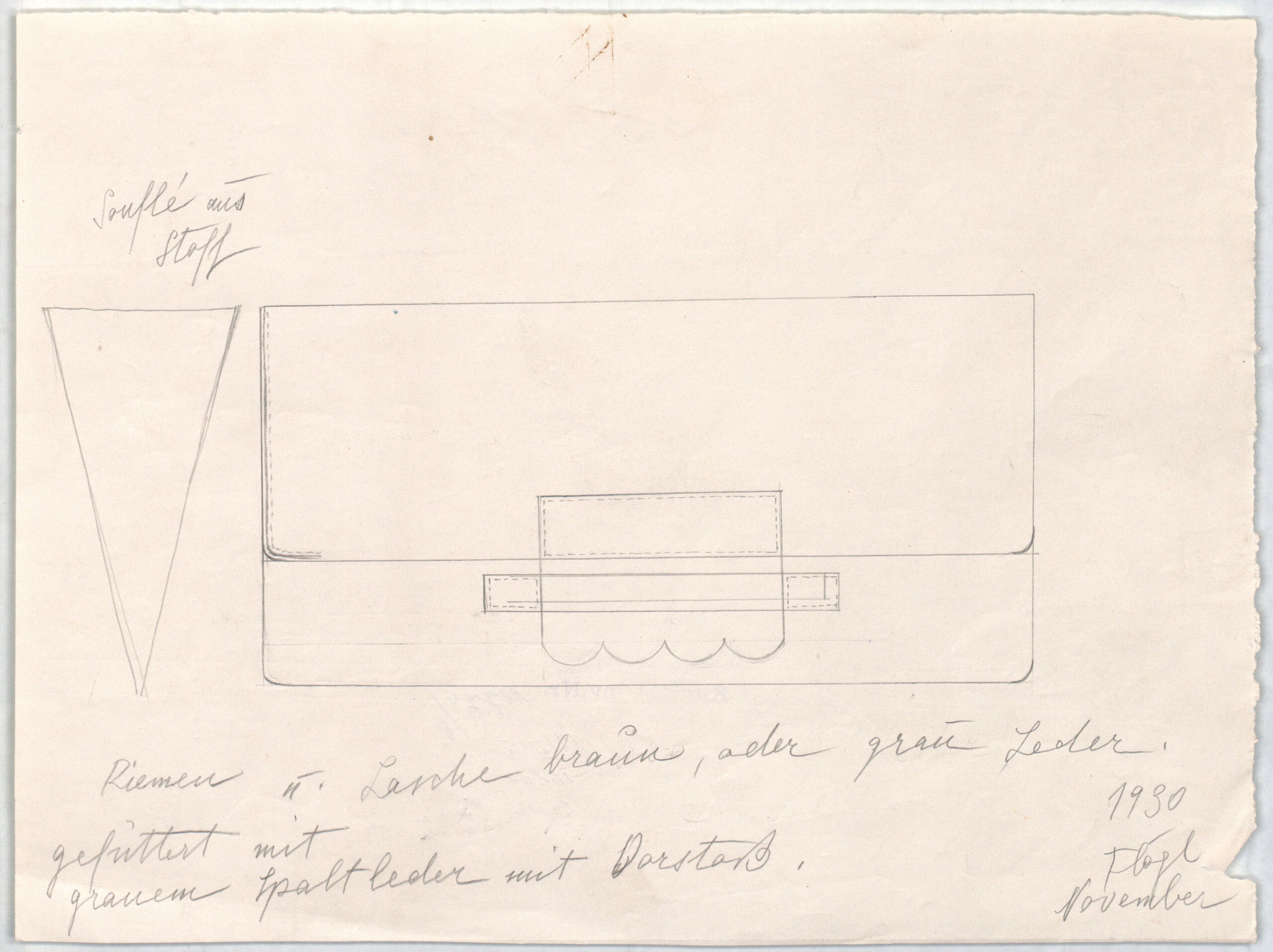 - text on object: Souflé aus Stoff/Riemen u. Lasche braun, oder grau Leder./gefüttert mit grauem Spaltleder mit Vorstoß./1930/Flögl/Novemberverso:Stempel/inventarisiert: 19./XI.30
