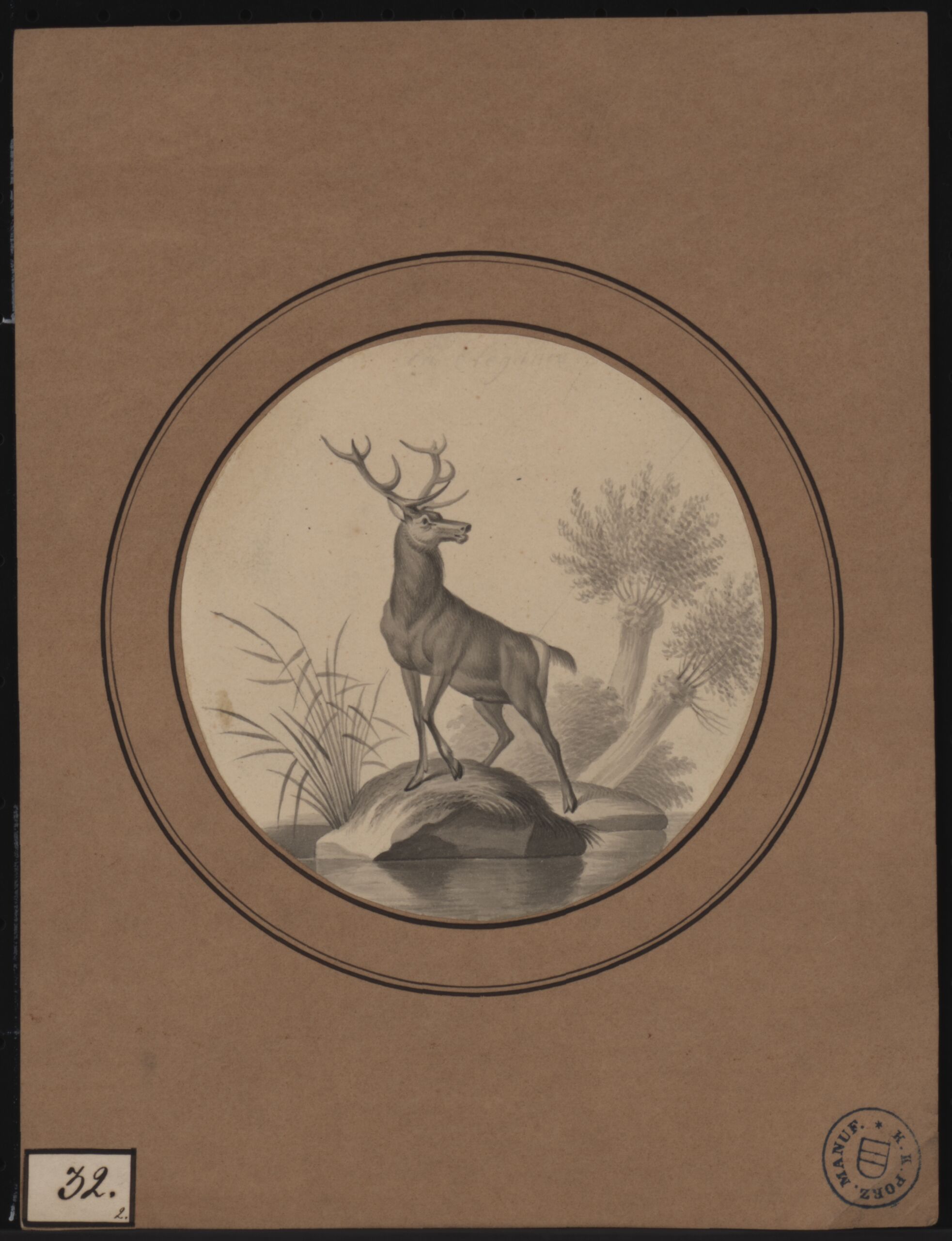 - plate mark: aufgeklebte Marke: 32.2. [Feder in Schwarz]