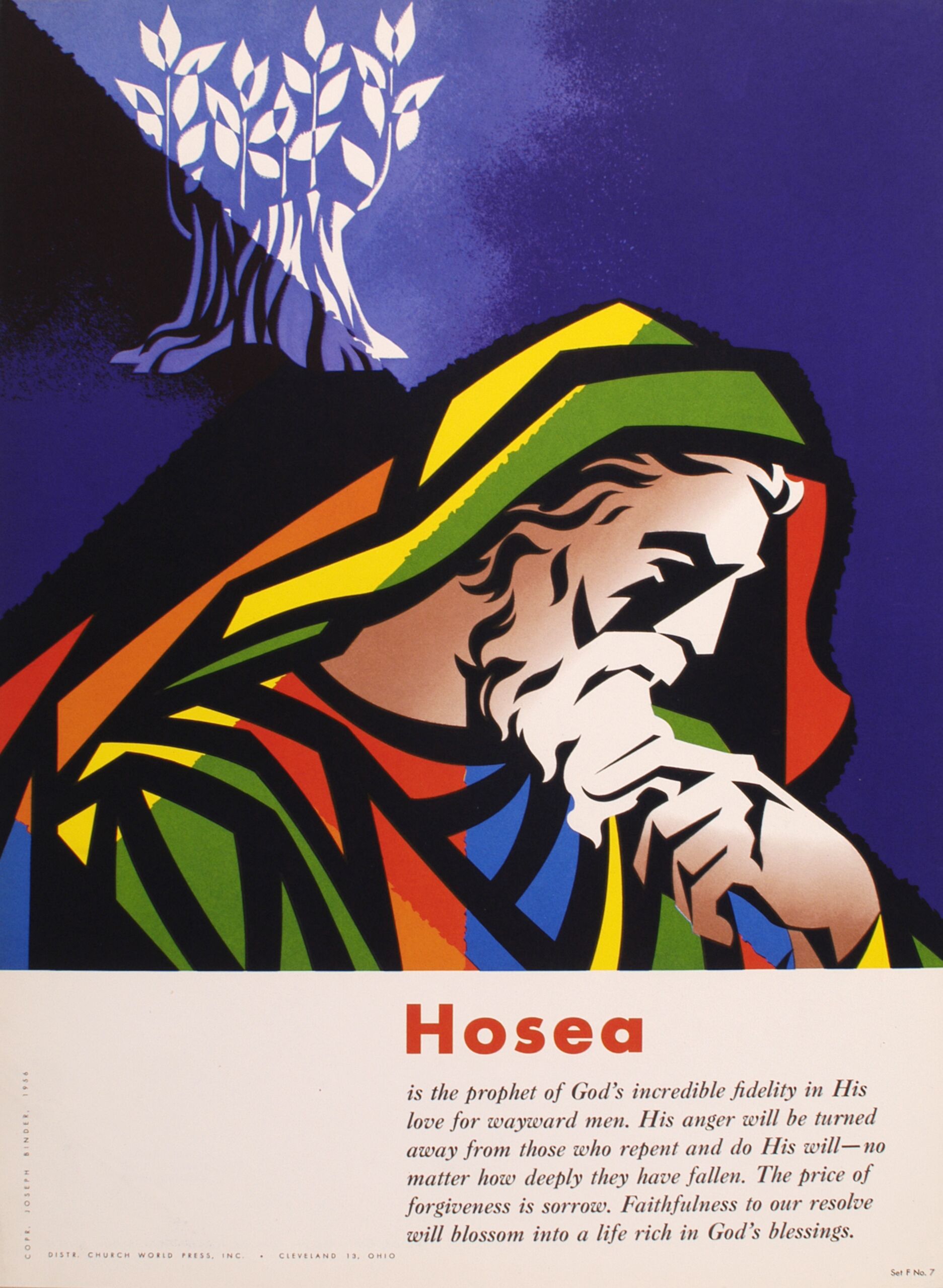 - text on object: Hosea is the prophet of God’s incredible fidelitiy in His love for wayward men. His anger will be turned away from those who repent and do His will - no matter how deeply they have fallen. The price of forgiveness is sorrow. Faithfulness to our resolve will blossom into a life rich in God’s blessing. Set F No.7