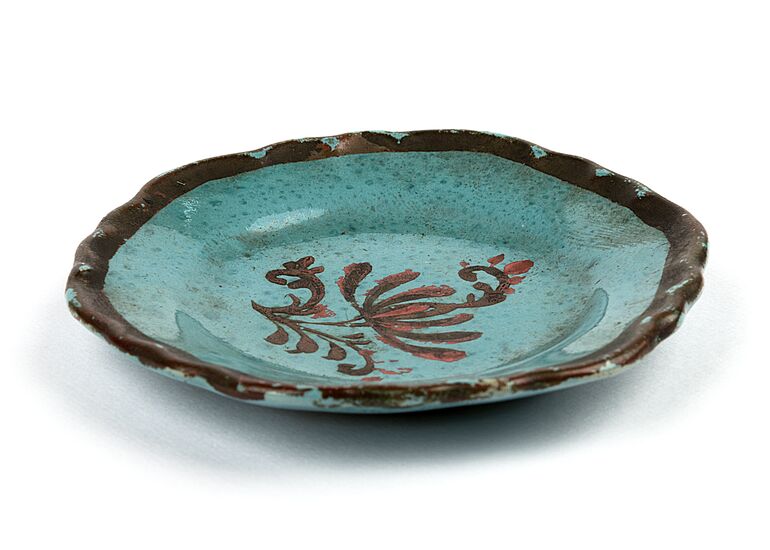 Weiße Fayence mit Bemalung in Emailfarben unter der Glasur