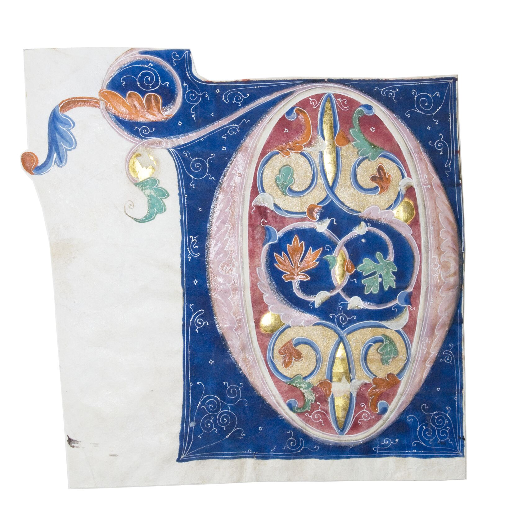 Teil eines Blattes einer Handschrift mit ausgeschnittener Initiale des Buchstabens "O". Der Körper der Initiale besteht aus Ranken und Akanthusblättern, die sich in der Randleiste fortsetzen und in Rosa, Blau und Orange ausgeführt sowie zusätzlich mit filigraner Ornamentik in Deckweiß und Elementen aus Blattgold verziert sind. Darum ist ein blauer Rahmen mit ebensolchen weißen Ornamenten. Das Binnenfeld ist auch mit Ranken und vegetabiler Ornamentik geschmückt. Auf dem Verso Textur und Notation im Wechsel, wobei es sich um Quadratnotation auf vier roten Linien handelt.