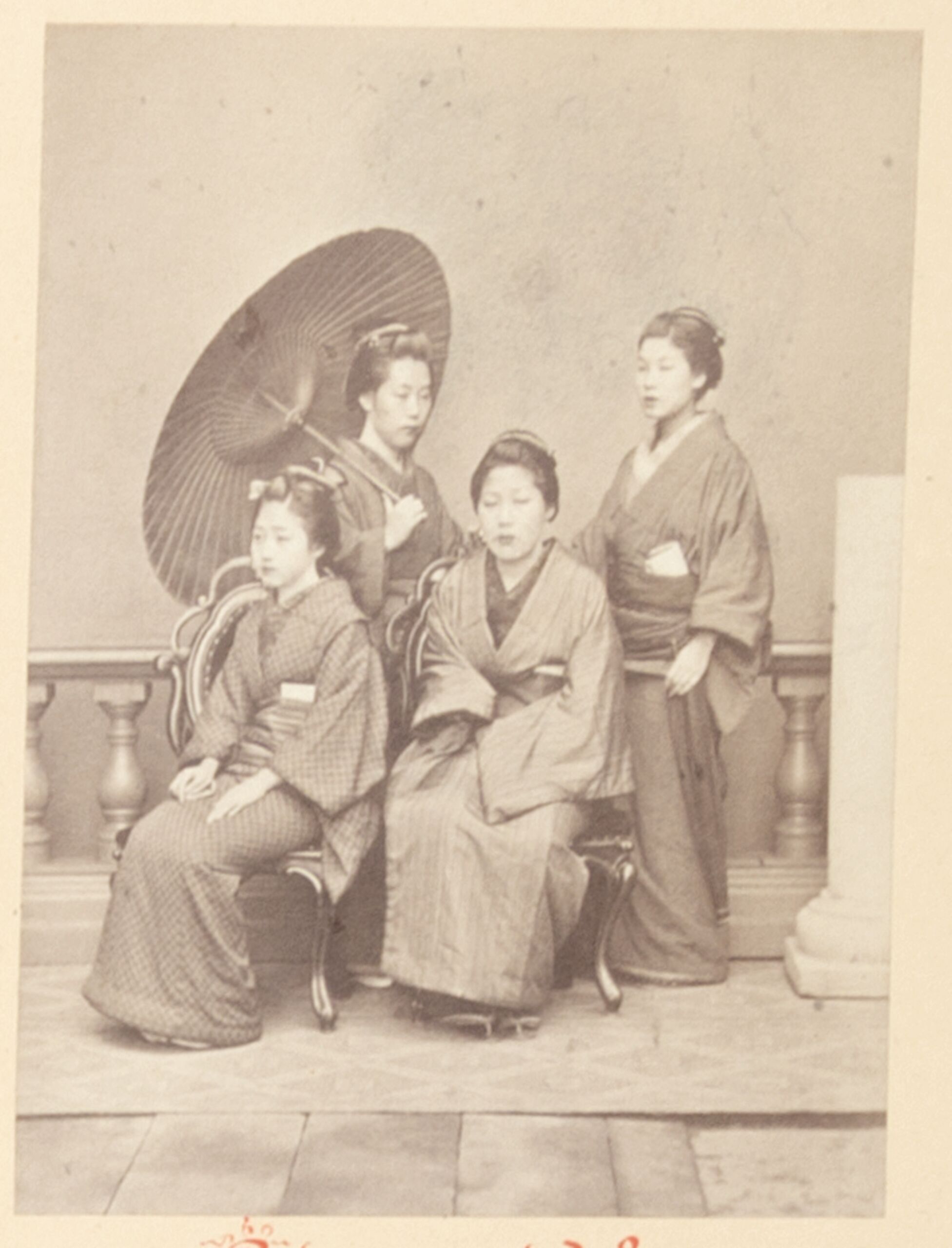 - text on object: [Blatt, mittig oben]: JAPAN.[Blatt, mittig unten]: Bürgermädchen.[Blatt, links unten]: Nach der Natur photographirt[Blatt, rechts unten]: von Wilhelm Burger.