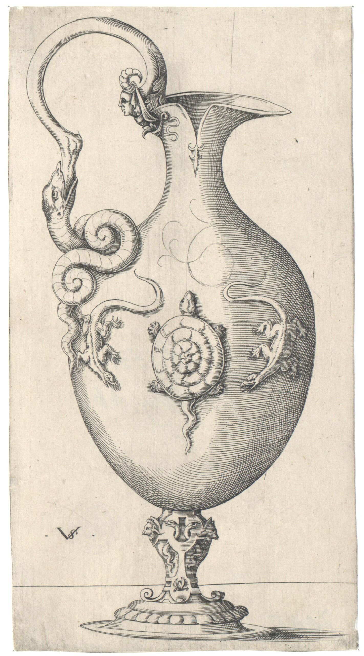 ornamental engraving, Kanne, auf dem Körper des Gefäßes eine Schildkröte zwischen zwei Eidechsen, Virgil Solis, MAK Inv.nr. KI 7095