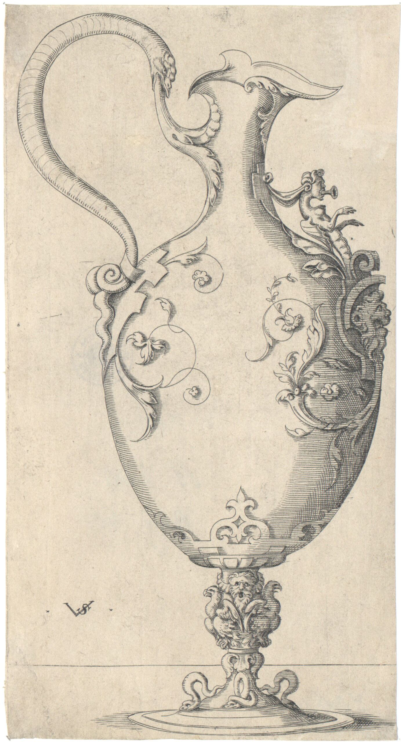 ornamental engraving, Kanne mit zwei Adlern, einer Maske und drei Schlangen am Fuß, Virgil Solis, MAK Inv.nr. KI 7094
