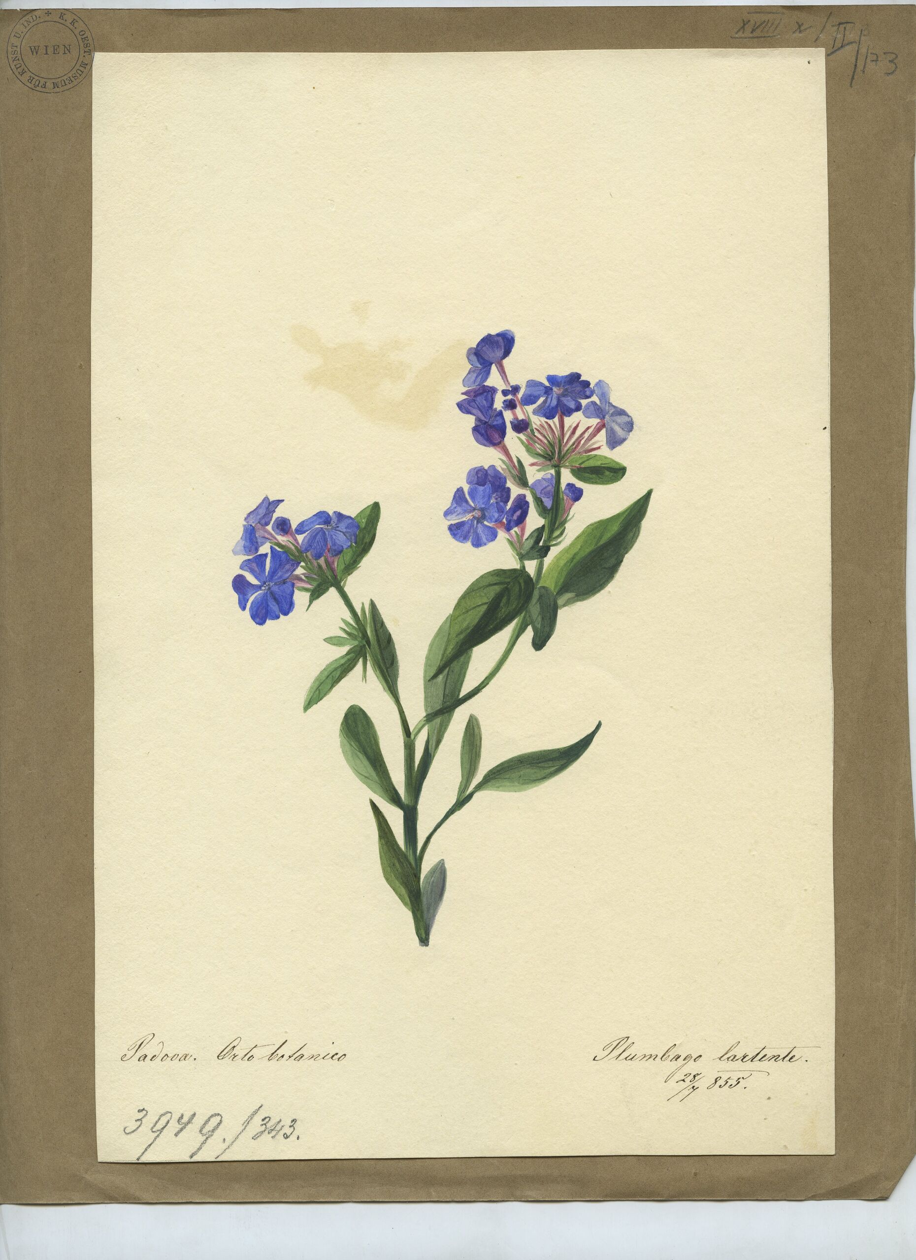 - text on object: Padova Orto botanico.; Plumbago Larpentae / 28/7 855. [Feder in Braun]