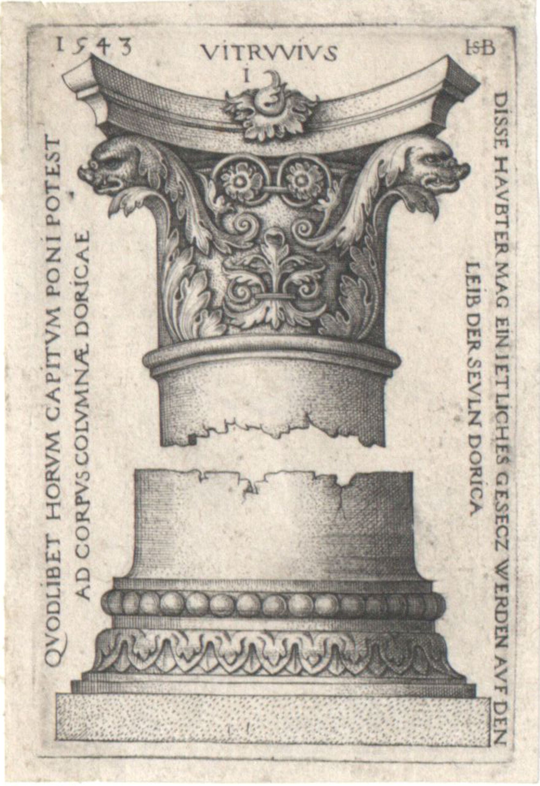 - text on object: VITRUVIUS I / 1543 Monogramm HSB / QUODLIBET HORUM ... DORICAE / DISSE HAVBTER ... DORICA