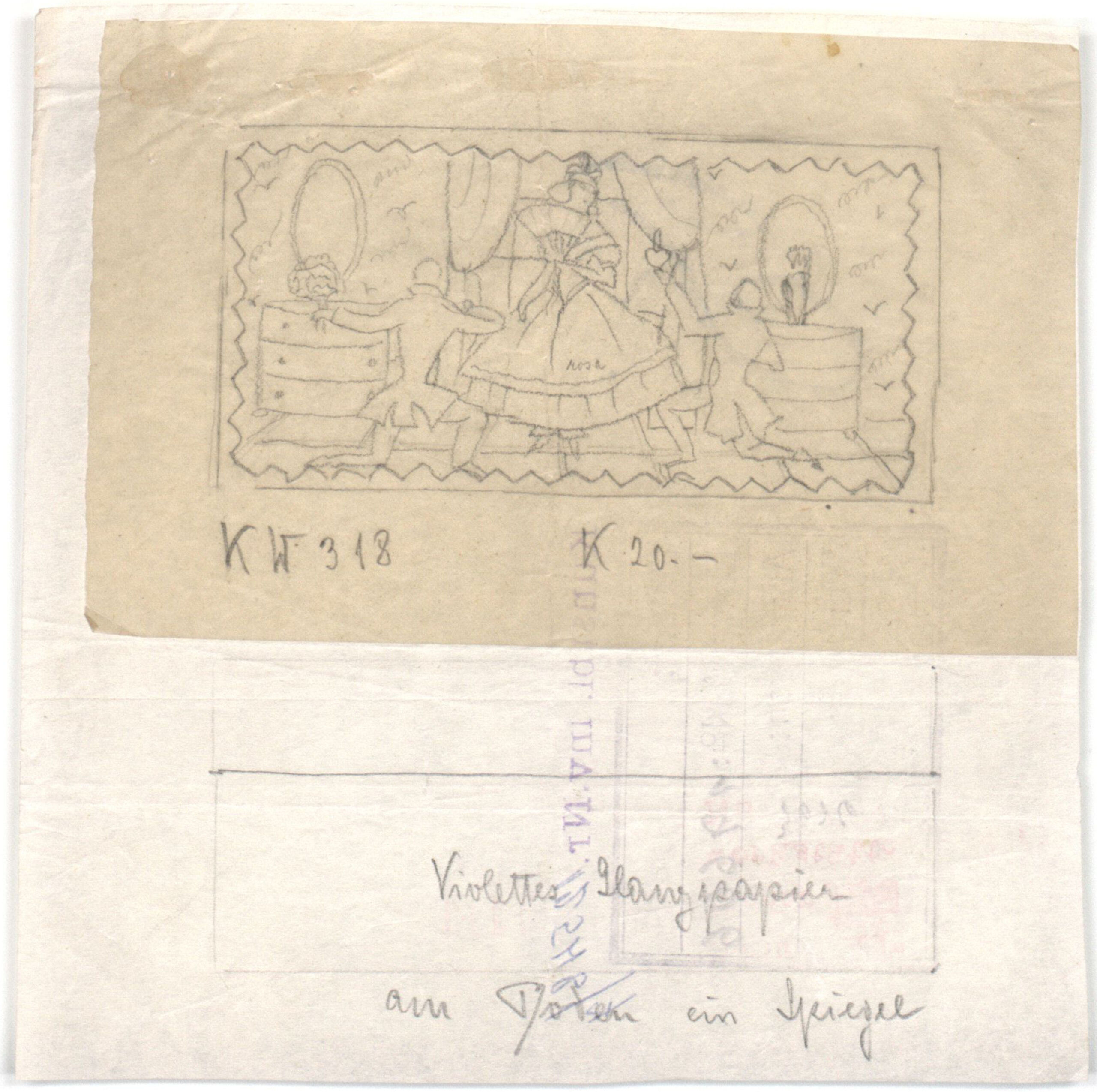 - text on object: K 20.-Violettes Glanzpapier/am Boden ein Spiegelverso: F