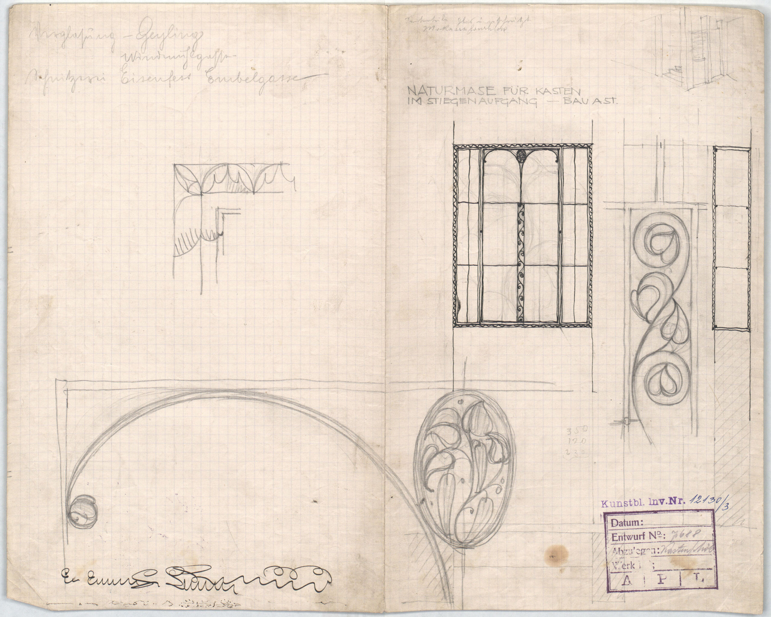 - text on object: NATURMASE (sic) FÜR KASTEN IM STIEGENAUFGANG - BAU ASTVerglasung - Geyling WindmühlgasseSchnitzerei Eisenfest Embelgasse