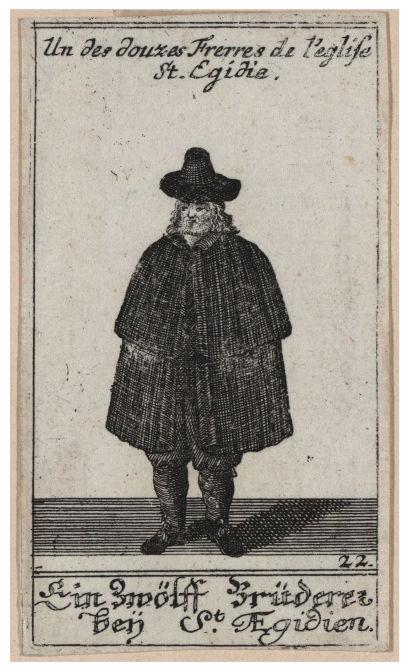 - text on object: Un des douzes Frerres de l´eglise / St- Egidie. 22. Ein Zwölf Brüderer / bei St. Egidien.