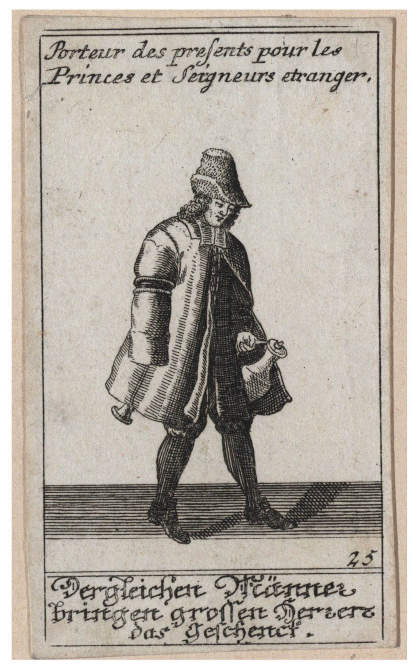 - text on object: Porteur des presents pour les / Princes et Signeurs etranger. 25 Vergleichen Männer bringen grossen Herren / das Geschenk.