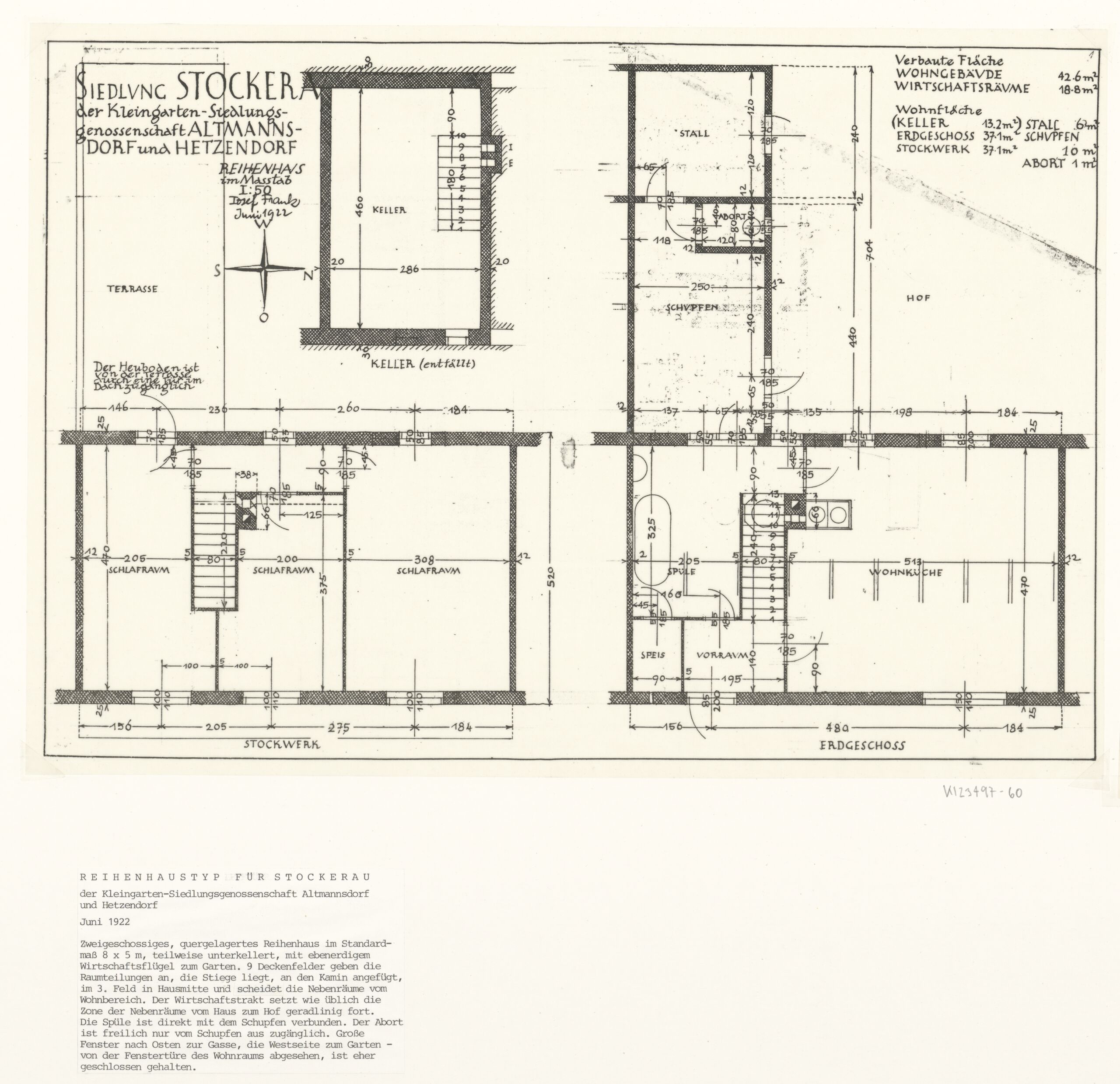 - text on object: Reihenhaustyp für Stockerauder Kleingarten-Siedlungsgenossenschaft Altmannsdorf und HetzendorfJuni 1922Zweigeschossiges, quergelagertes Reihenhaus im Standardmaß 8x5 m, teilweise unterkellert, mit ebenerdigen Wirtschaftsflügel zum Garten. 9 Deckenfelder geben die Raumteilungen an, die Stiege liegt, an den Kamin angefügt, im 3. Geld in Hausmitte und scheidet die Nebenräume vom Wohnbereich. Der Wirtschaftstrakt setzt wie üblich die Zone der Nebenräume vom Haus zum Hof geradlinig fort. Die Spüle ist direkt mit dem Schupfen verbunden. Der Abort ist freilich nur vom Schupfen aus zugänglich. Große Fenster nach Osten zur Gasse, die Westseite zum Garten - von der Fenstertüre des Wohnraums abgesehen, ist eher geschlossen gehalten.