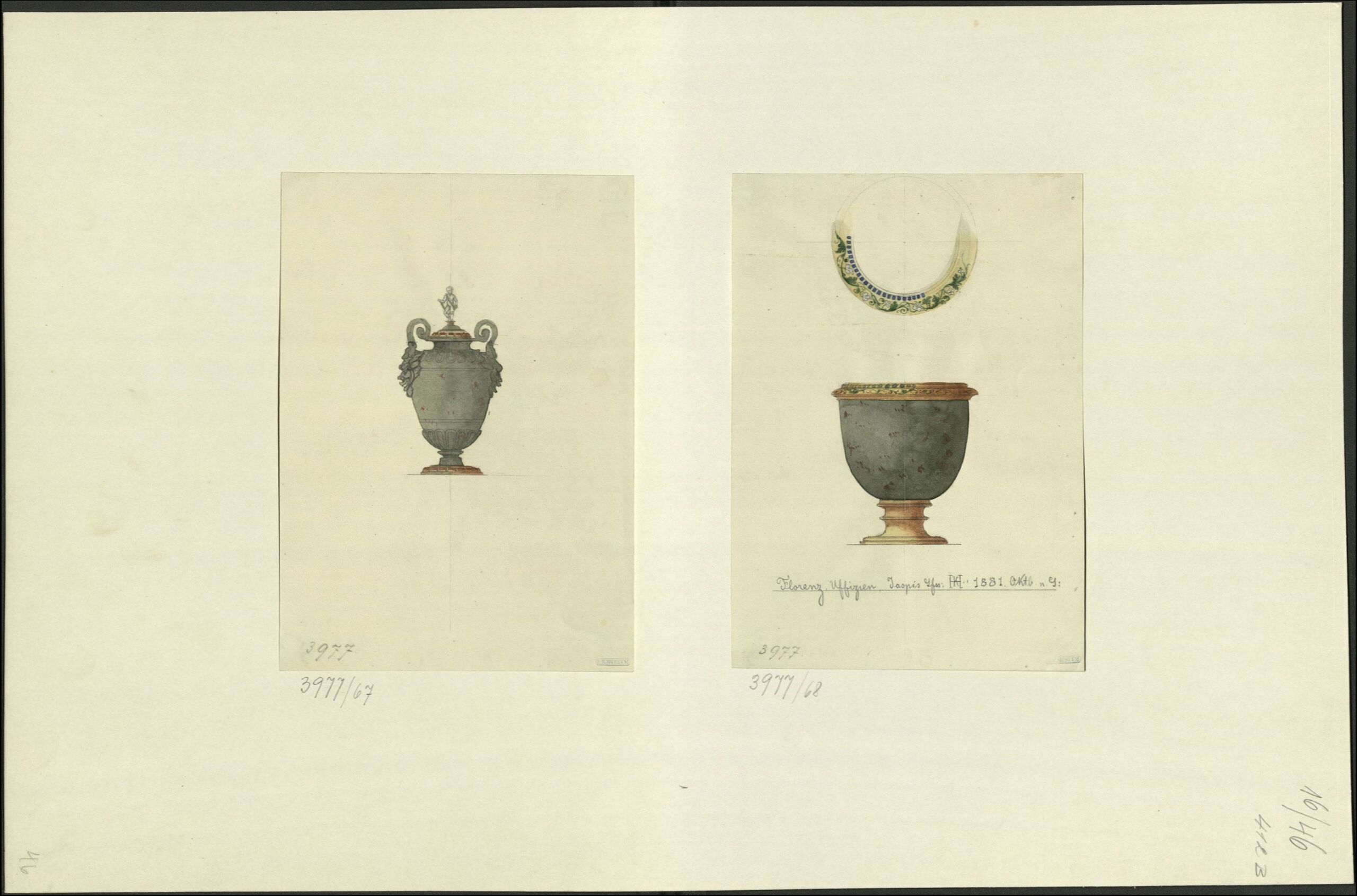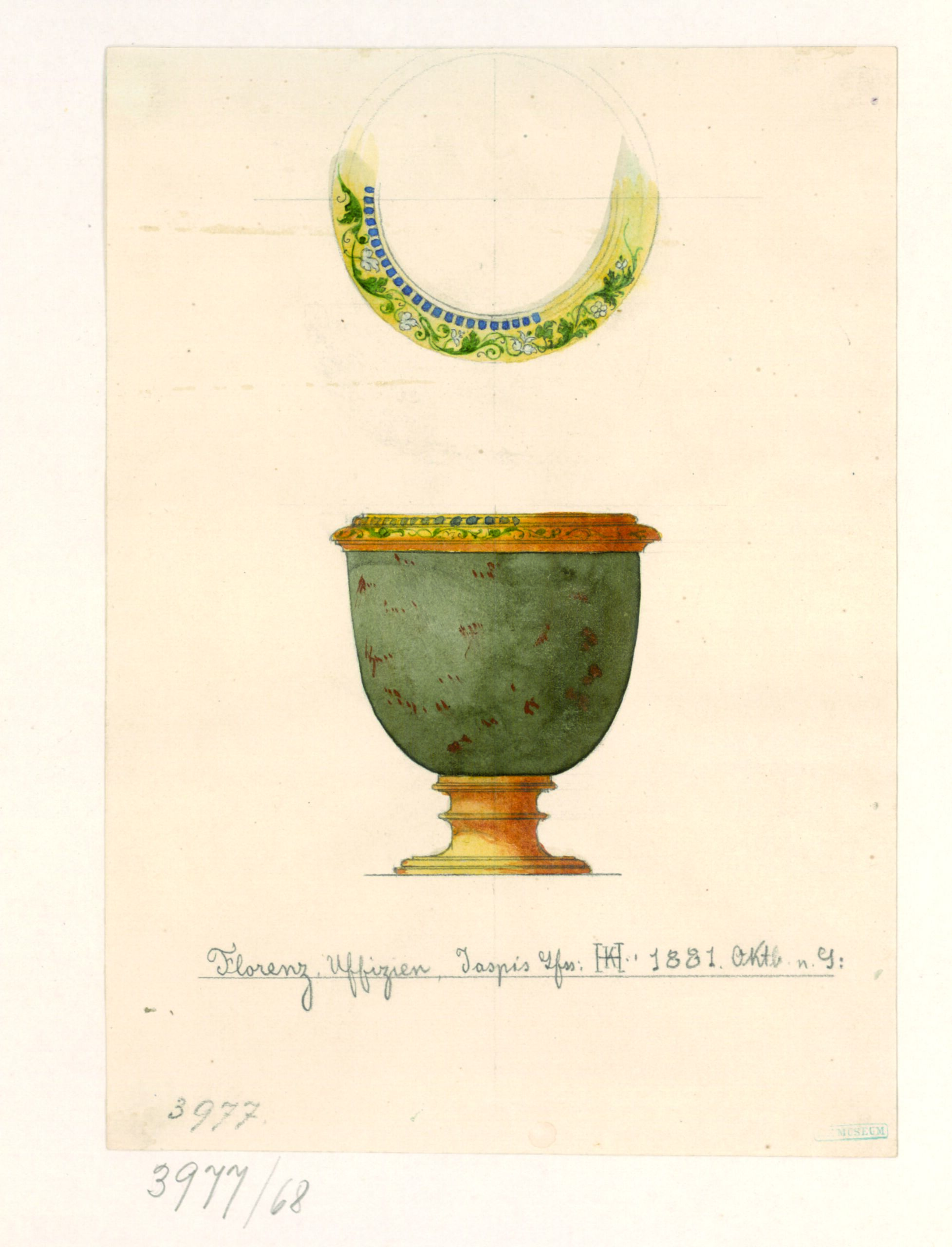 - text on object (unten) : "Florenz. Uffizien, Jaspis Gfss: HK [Monogramm Heinrich Kautsch: "K" im Balken des "H"]: 1881. Oktb. n. G: / 3977."