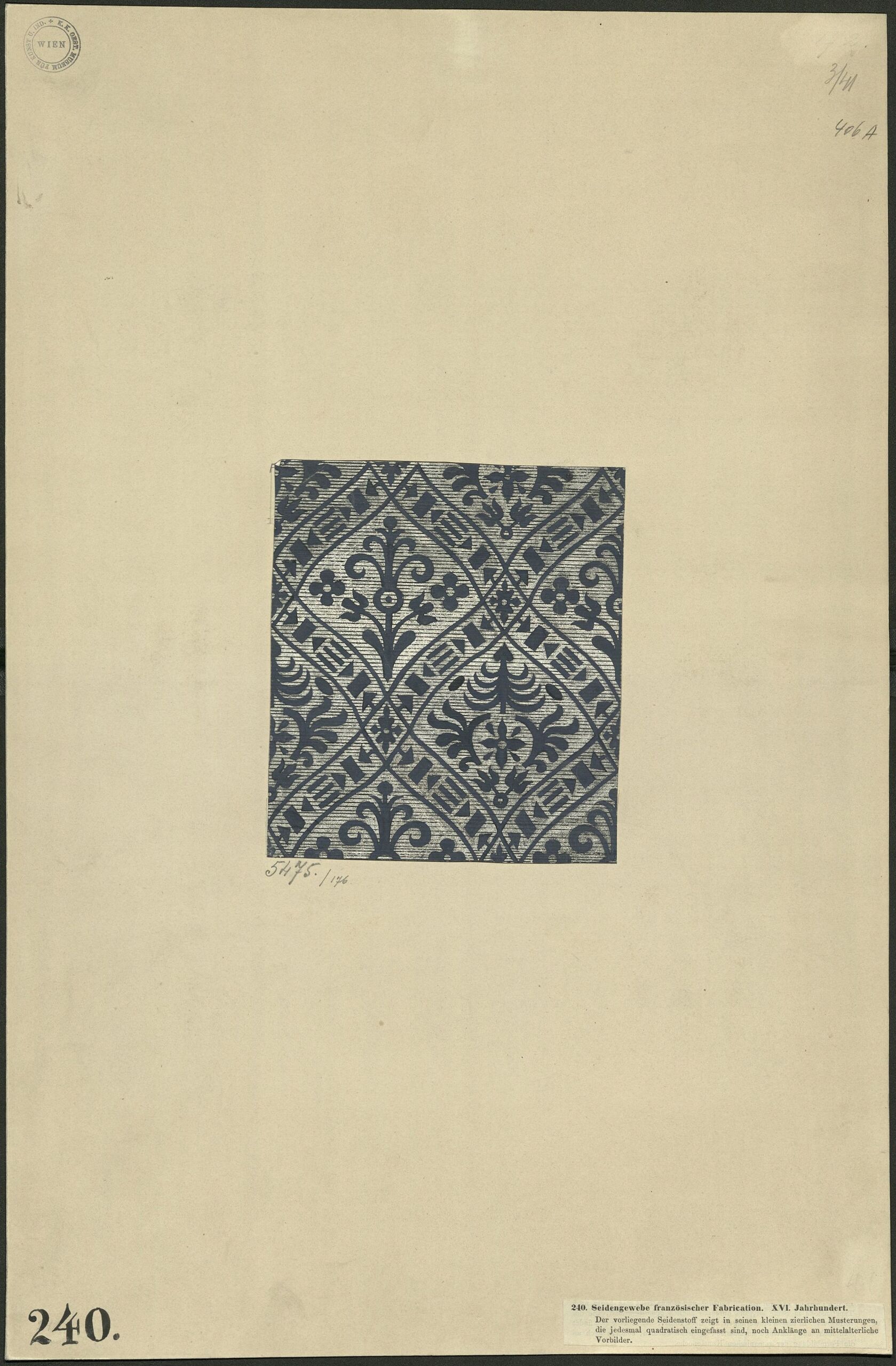 - sticker / adhesive label (rechts unten) : 240. Seidengewebe französischer Fabrication. XVI. Jahrhundert. / Der vorliegende Seidenstoff zeigt in seinen kleinen zierlichen Musterungen, [...].