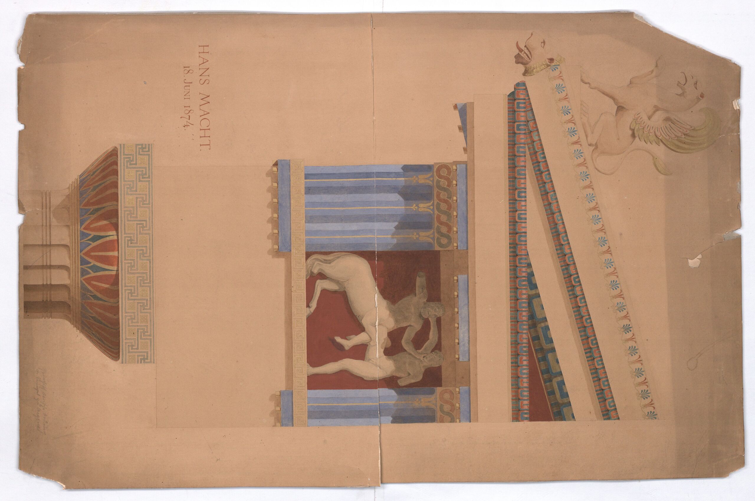 - text on object: HANS MACHT. / 18. JUNI 1874 [Pinsel in roter Tusche]; Griechisch dorische Ordnung / am Tempel zu Aegina [Bleistift]