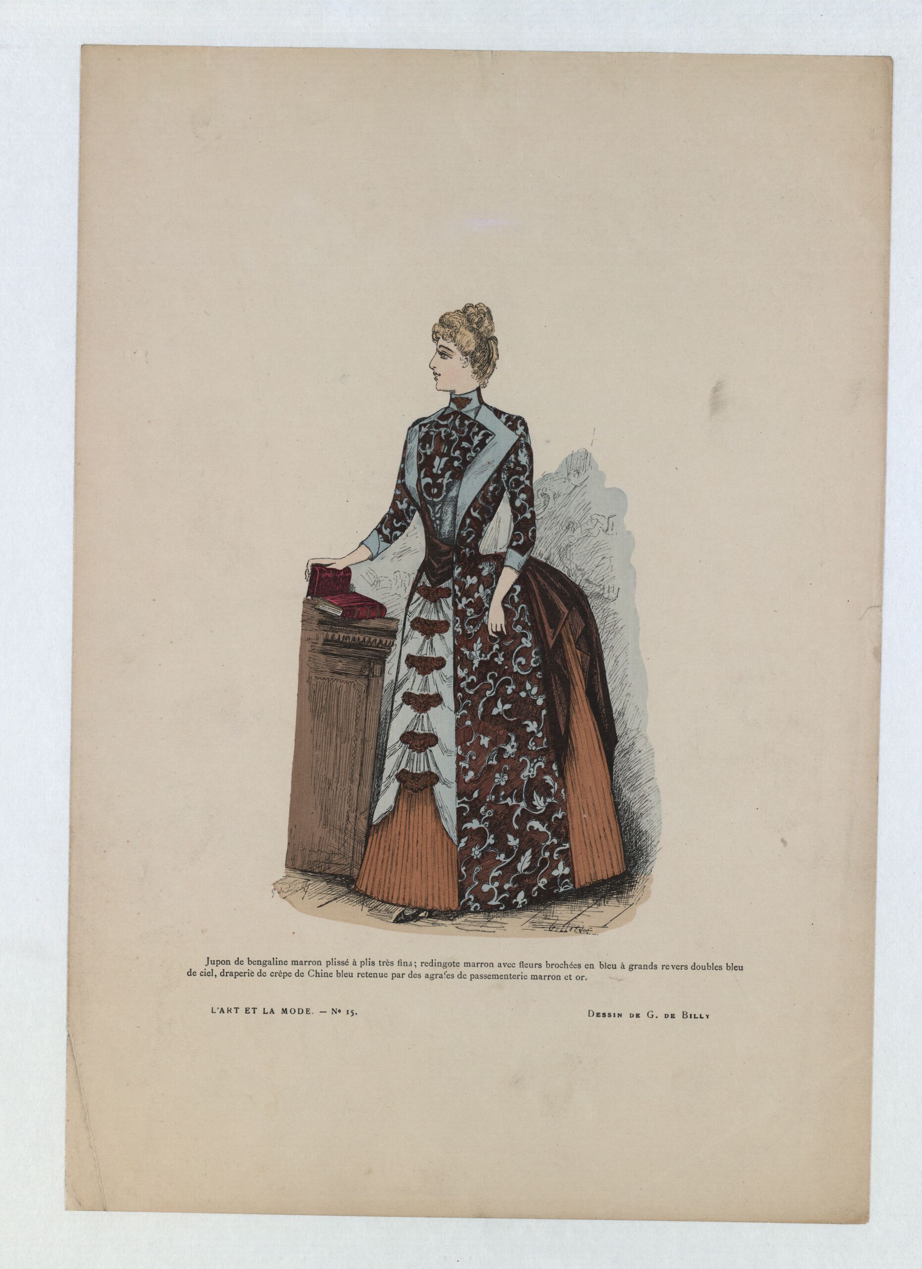 - text on object: Jupon de bengaline marron plissé à plis très fins; redingote marron avec fleurs brochées en bleu à grands revers doubles bleu / de ciel, draperie de crêpe de Chine bleu retenue par des agrafes de passementerie marron et or. / L´ART ET LA MODE. - No 15. DESSIN DE G. DE BILLY.