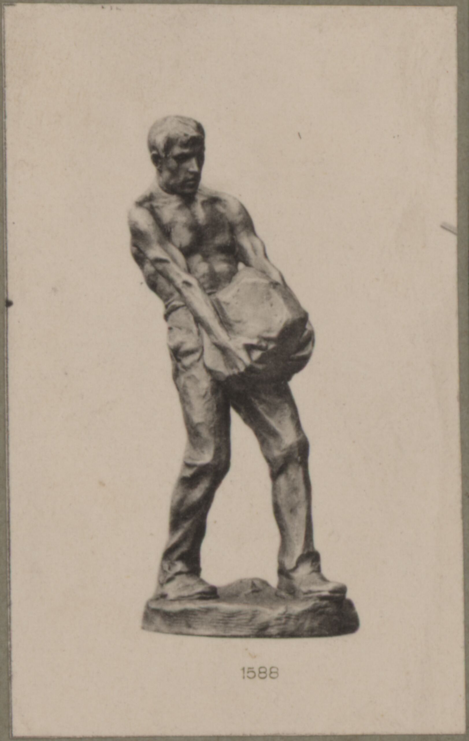 - text on object: [mittig unten]: 1588[Untersatzkarton, rechts unten]: "Steinträger" / No. 1588/38 auf Bronzeplinthe 12,5 x 17, 38[Untersatzkarton, rechts unten]: v. H. Müller Bildhauer, Wien