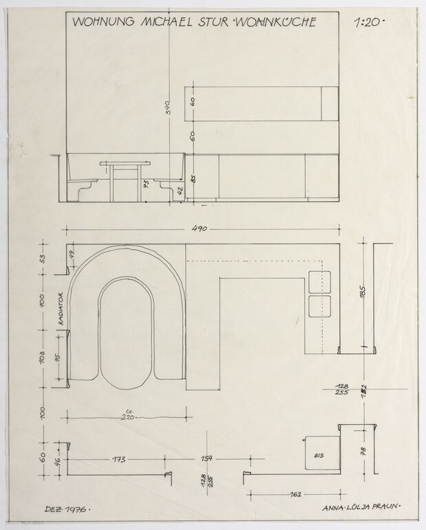 - Text am Objekt (rechts unten) : AUSFÜHRUNG WIE / DIE ANEREN (sic!) KASTEN IM RAUM / NATURMASS DER / KARTOTHEK NEHMEN! / UND HÖHE DES / WICKELTISCHES