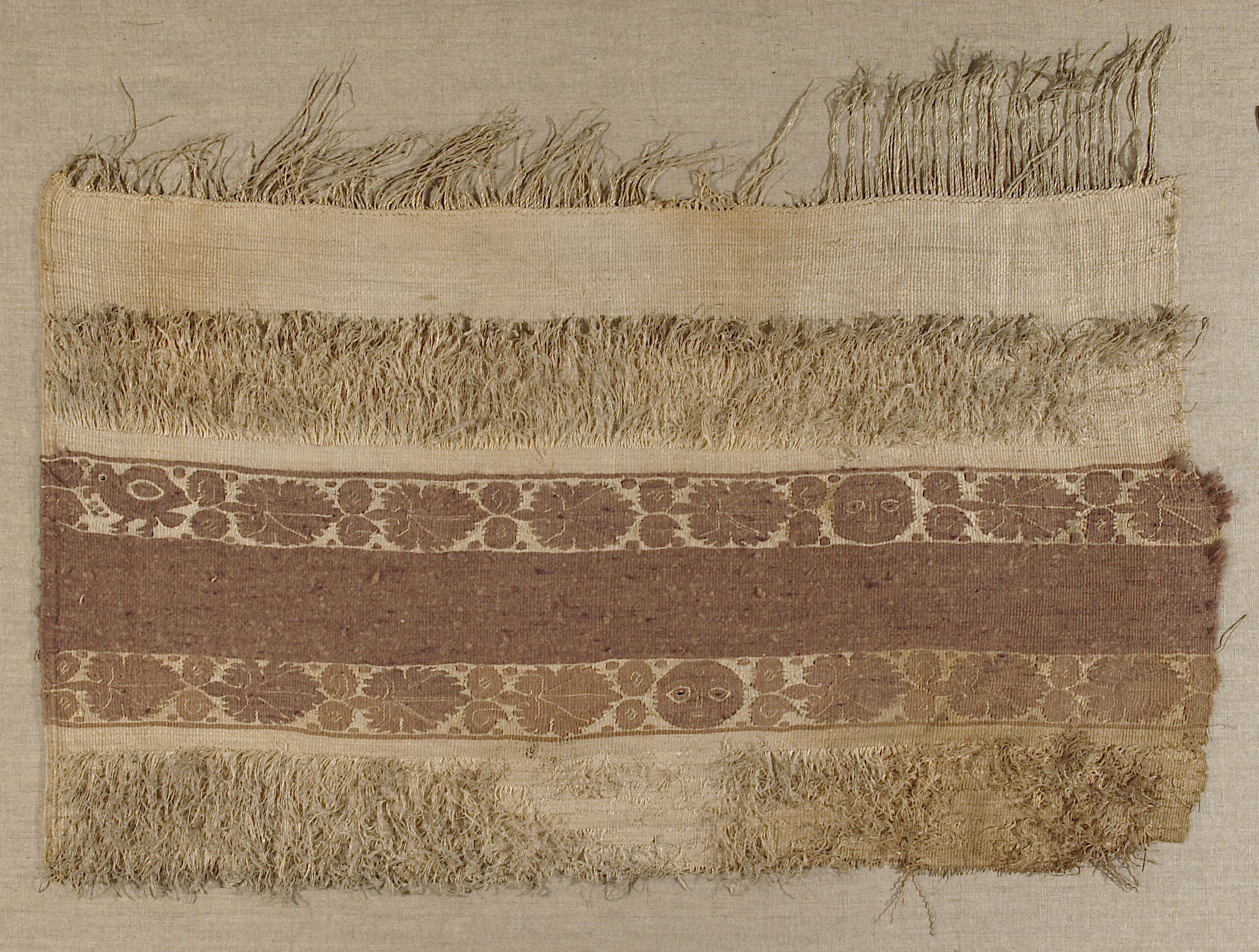 - Linen cloth with fringes, loops and a decorative stripe; pattern of vine leaves, faces and birds (descriptive title)