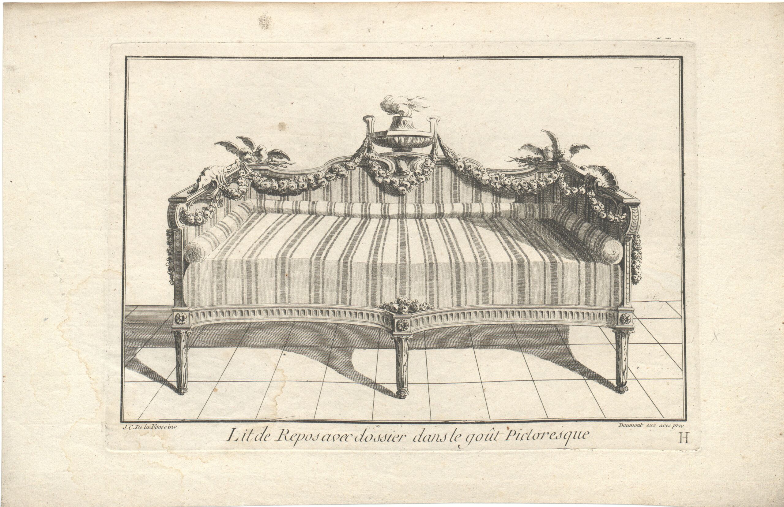 - text on object: Lit de Repos avec dossier dans le gout Pitoresque / J. C. De la Fosse inv., Daumont exc avec priv / H
