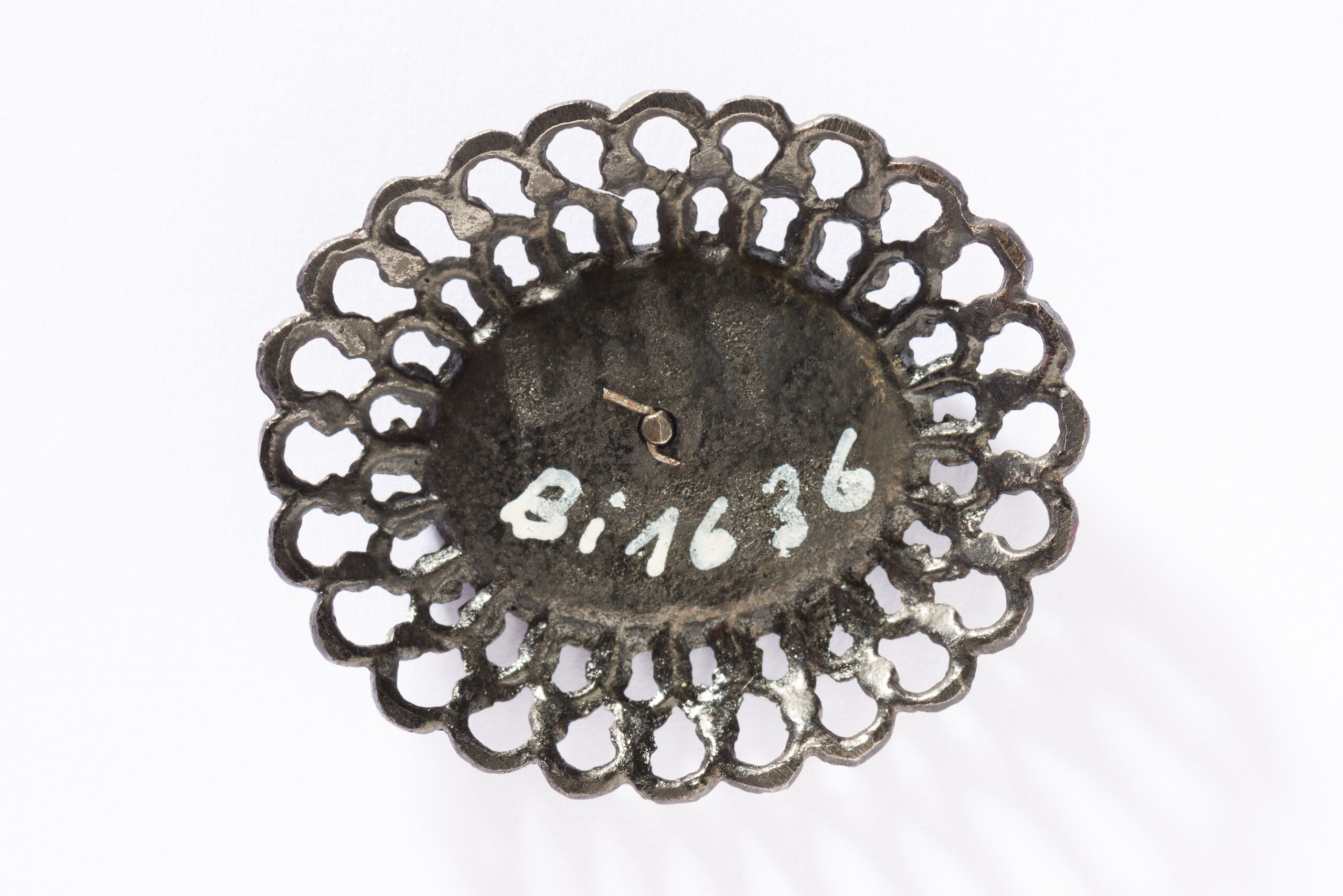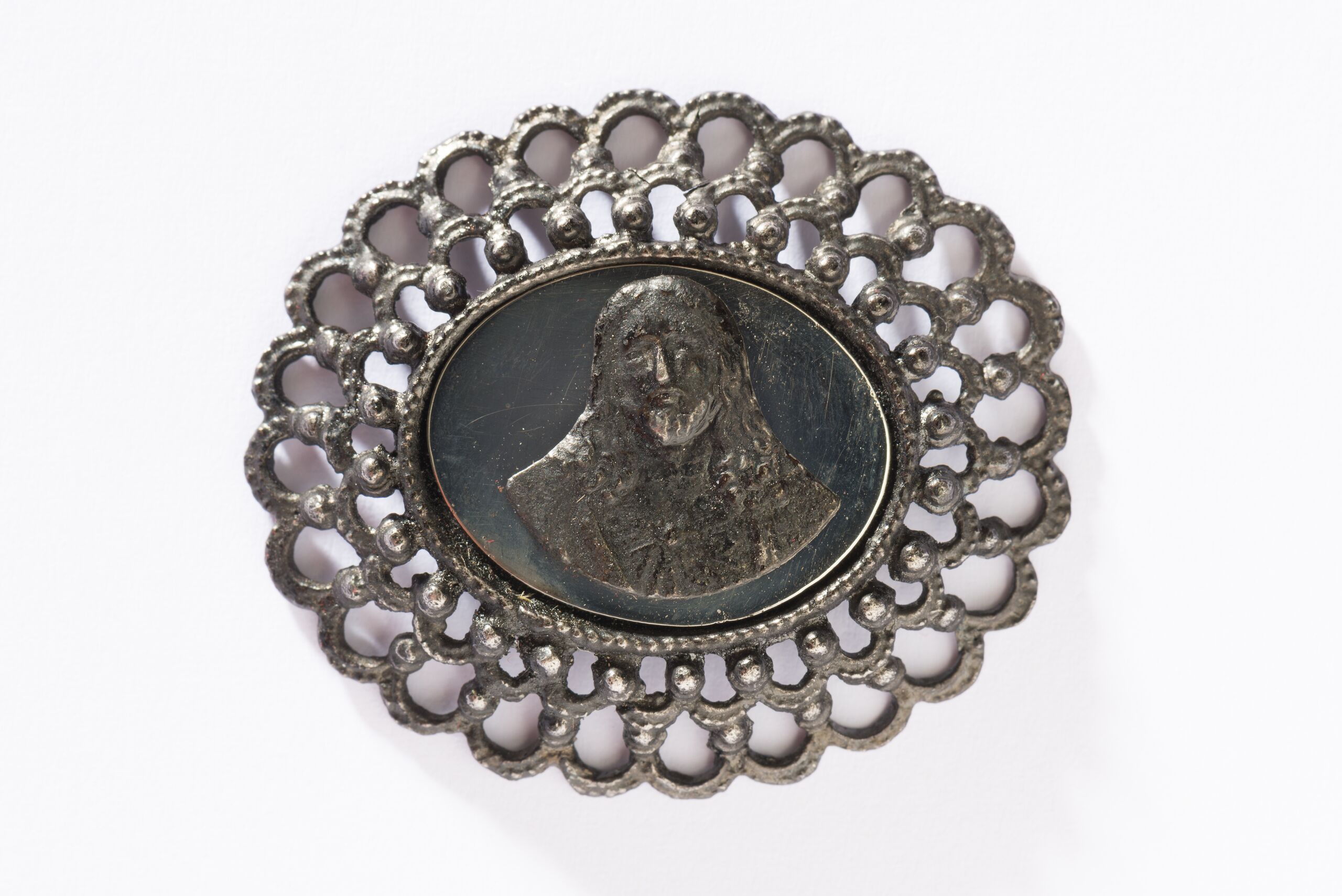 Eine ovale Stahlplatte wird von einer Doppelreihe Rundbogen gerahmt. Auf der Platte ist ein Christuskopf aus Eisenguß im Relief wiedergegeben.