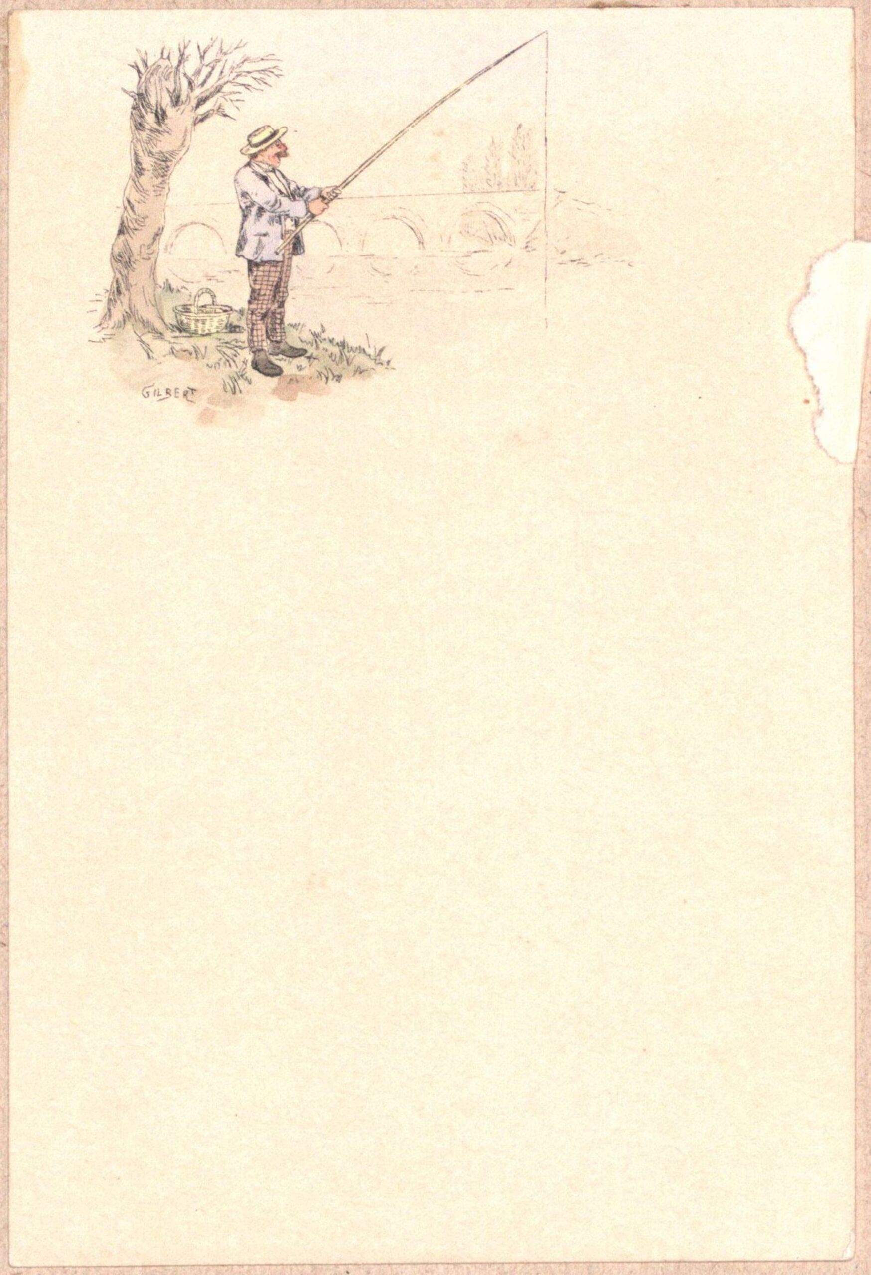 menu, Menükarte mit der Darstellung eines Anglers am Rande eines Flusses vor einer Brücke, Gilbert, MAK Inv.nr. KI 7476-58